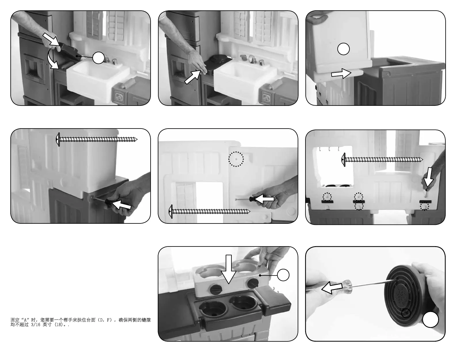 固定“A”时,您需要一个帮手来扶住台面(D,F),确保两侧的缝隙