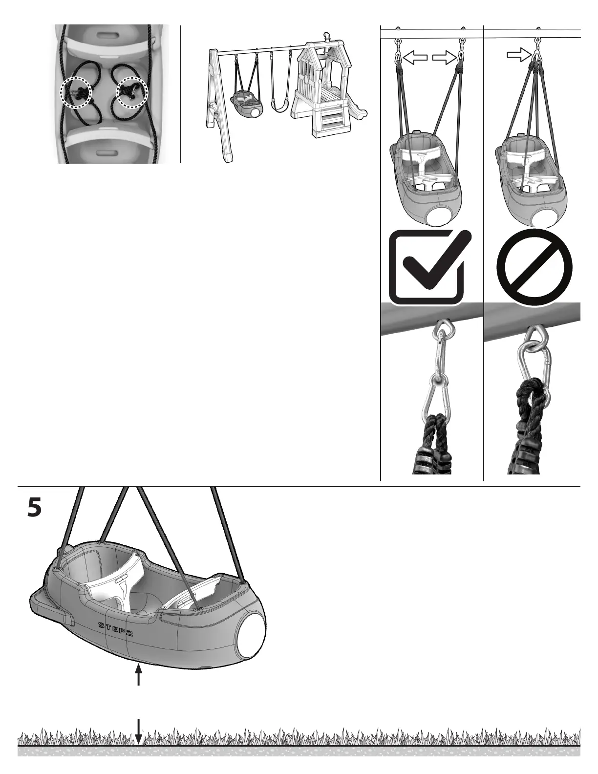 始终在两个锚钩之间安装摆动,不要只安装到一个。绳索不应重叠或扭曲,将钩子定位,使小