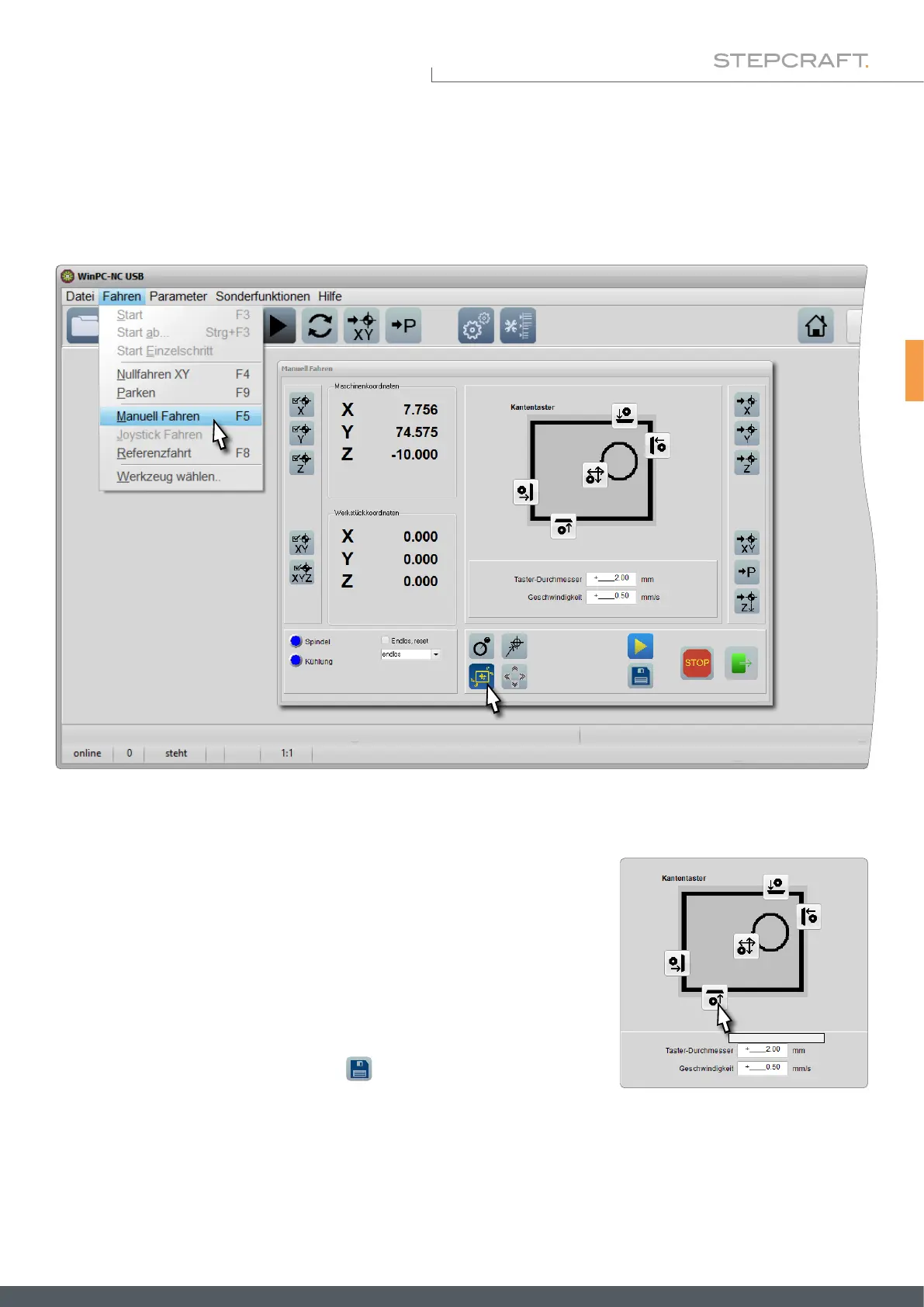 Um das Menü zur Steuerung des 3D-Tasters zu öffnen, starten Sie WinPC-NC, klicken Sie Fahren – Manuell Fahren oder