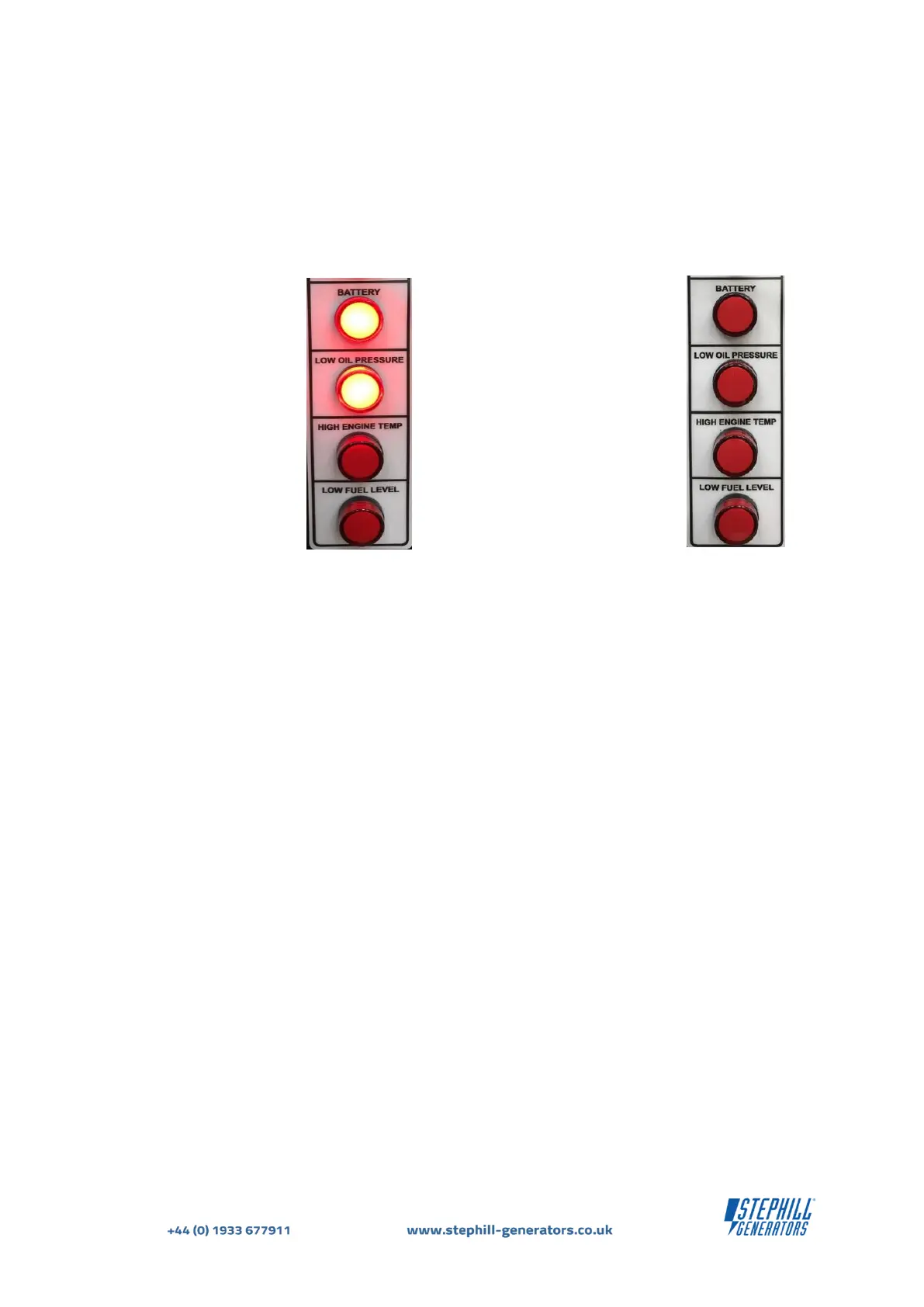 Turn the key to the RUN position. The BATTERY and the LOW OIL PRESSURE red LED's will illuminate - Fig.11.