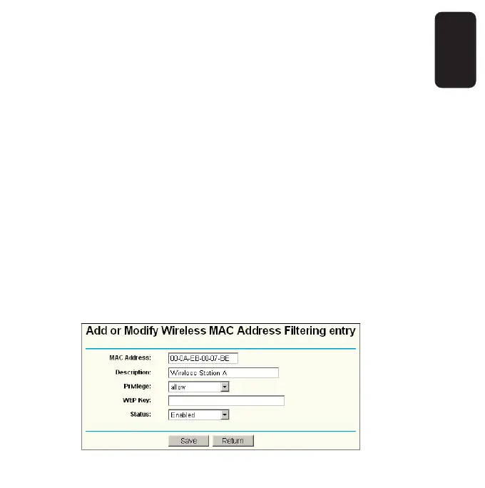 button. The “Add or Modify Wireless MAC Address Filtering entry” page