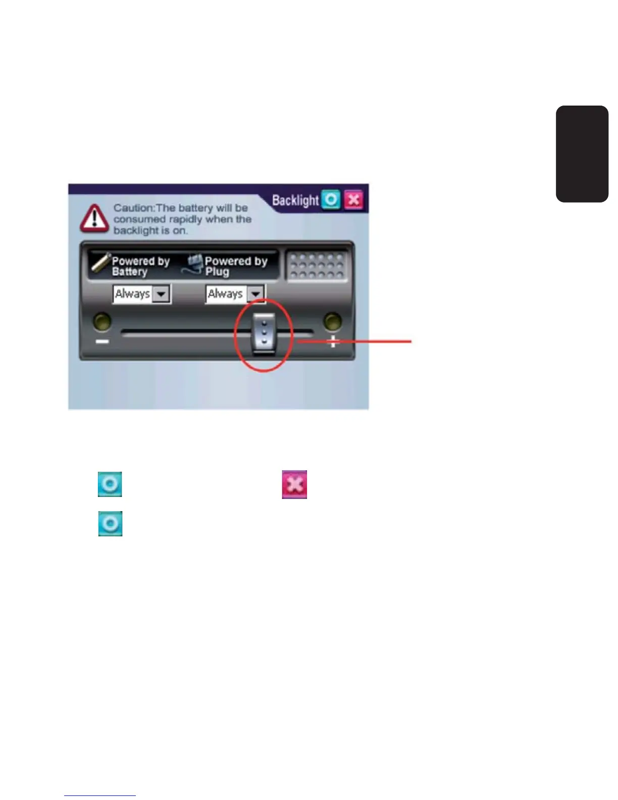 3.- Scroll the brightness bar to control backlight brightness. There are