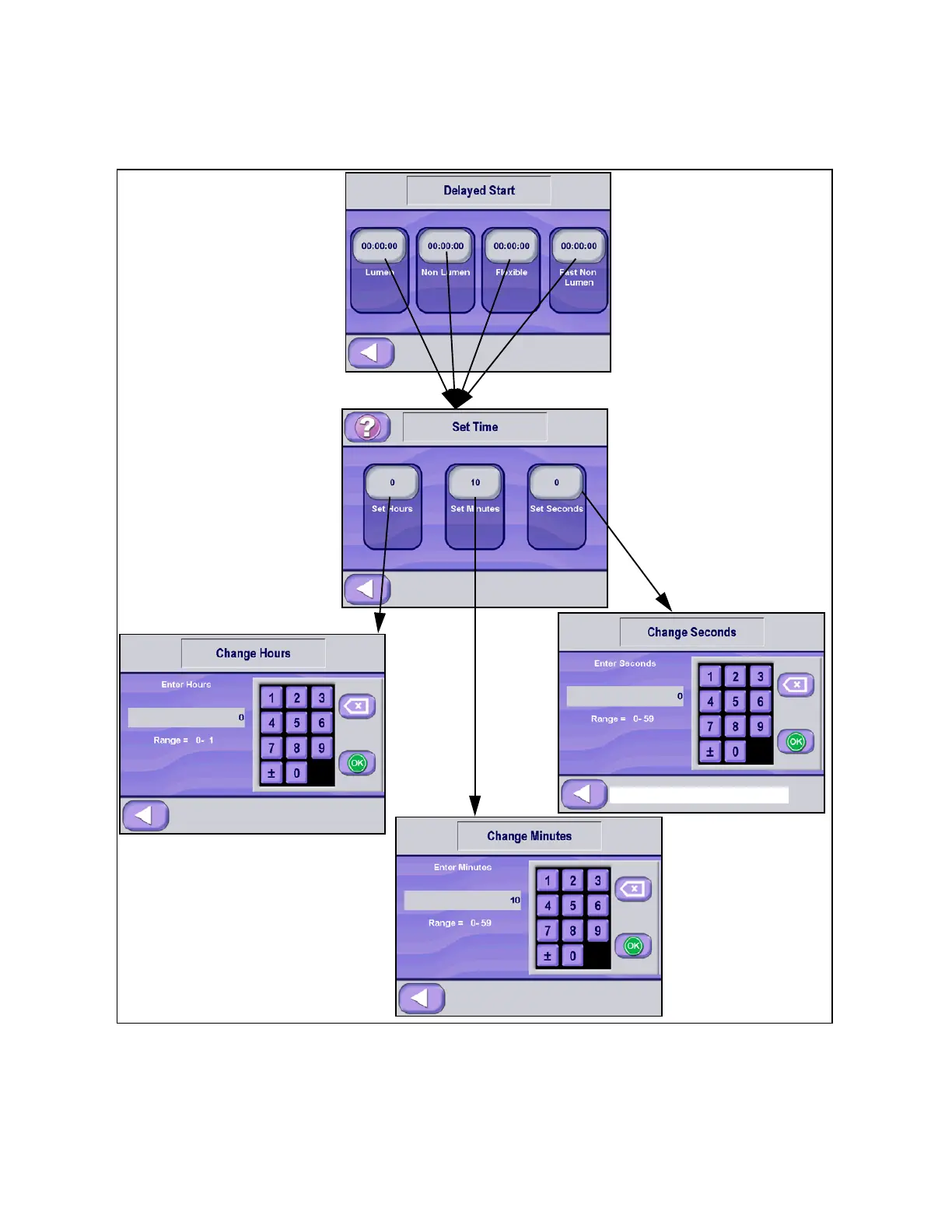 The DELAYED START screen enables the Supervisor to setup the Sterilizer to complete a Lumen, Non Lumen, Fast Non