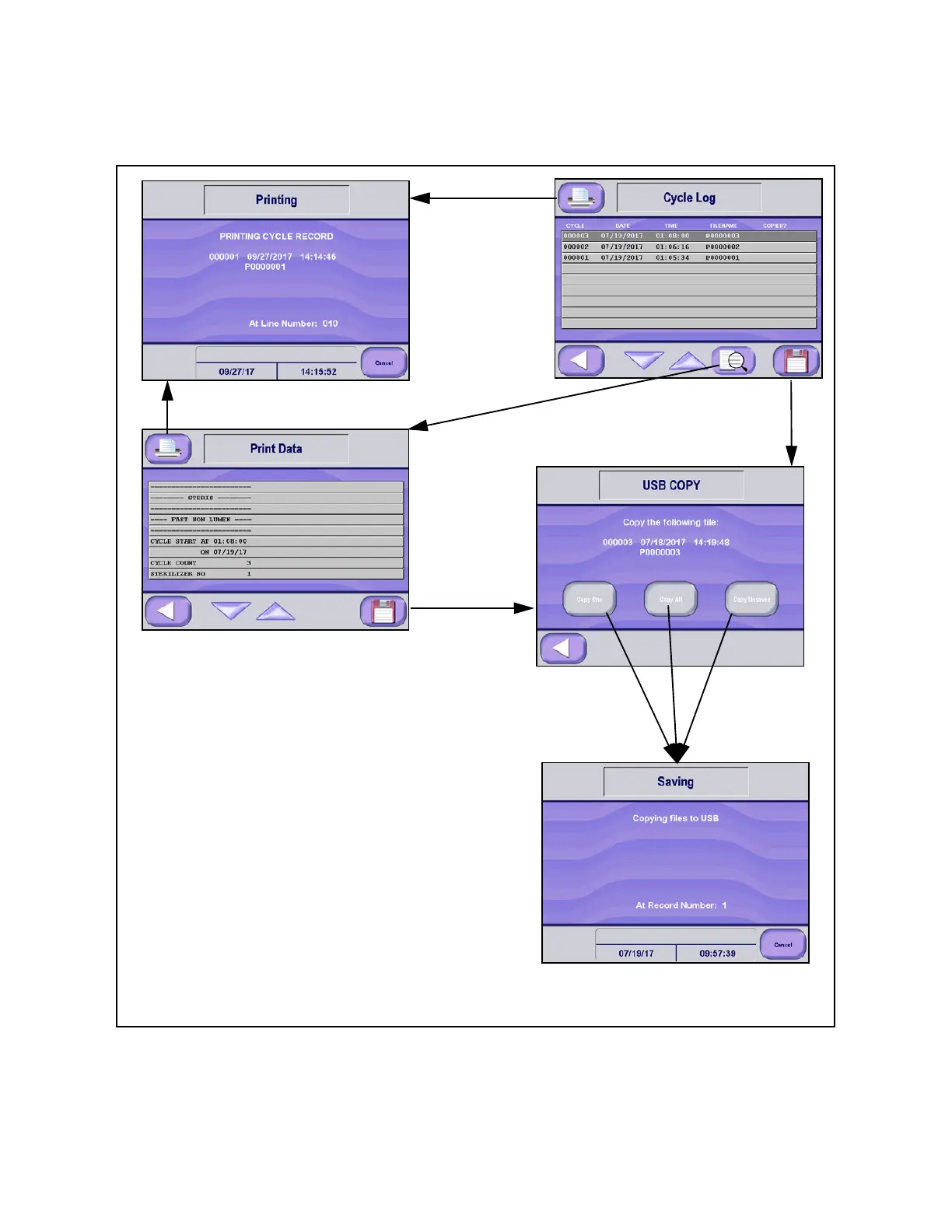 The CYCLE LOG screen enables the Supervisor to print the Sterilizer Cycle and data or store this information on a USB