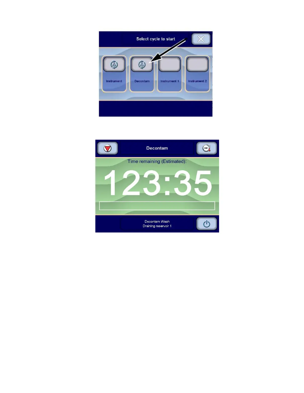 6. Press Decontam cycle button on touch screen. All reservoirs drain completely to ensure only clean water is being