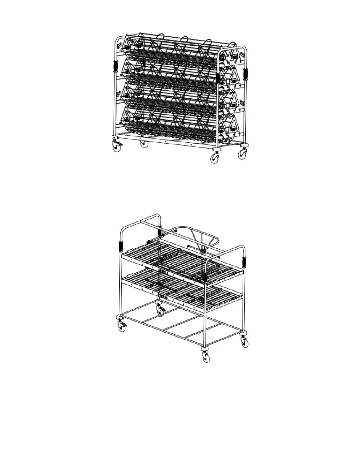 rack equipped with rotary spray arms that can hold DIN trays and instrument trays.