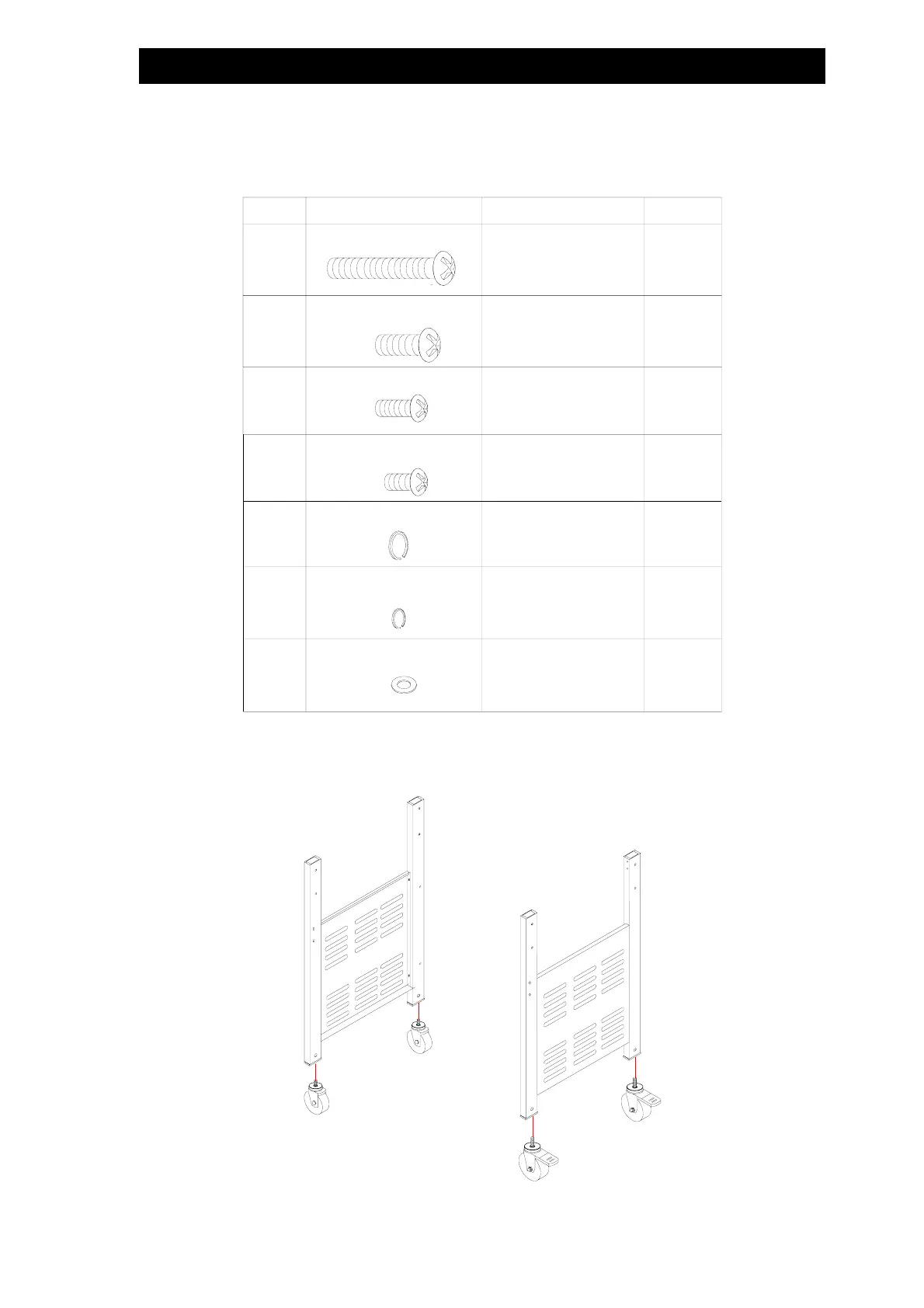 Step1: Remove side panels and casters from the carton. Secure two casters to the left