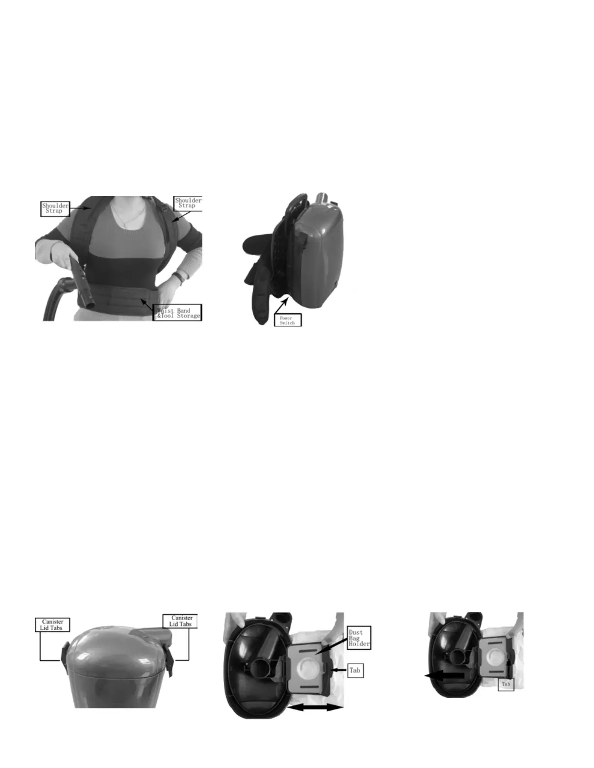 2. Pull the tab on the dust bag holder out slightly and upwards.