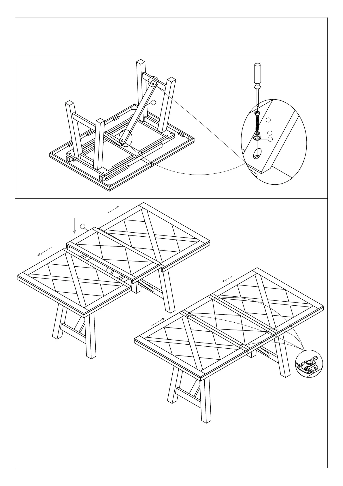 both ends, place Leaf (B) in position. Lock the latch underneath of the table top to prevent from sliding. Assembly product is