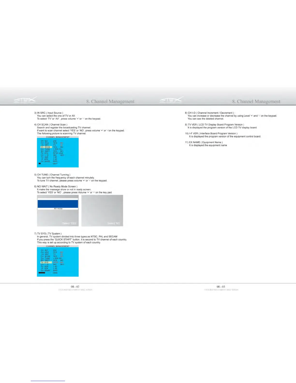 stex 8020RL - Input Source and Channel Scan; Channel Tuning and System Settings; Program Version and Equipment Name