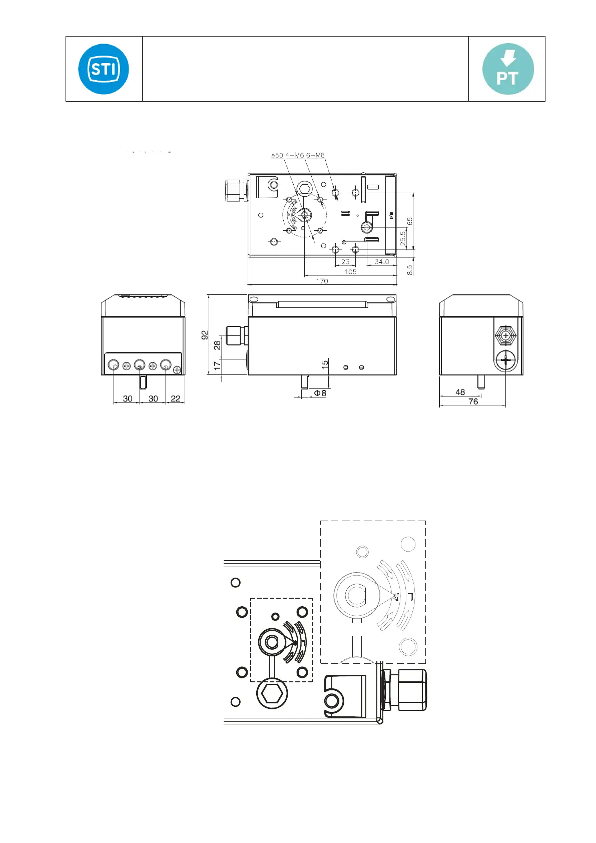 shows the positioner feedback indicator and the arrow marking indicator’s rotating range. Solid line shows the middle