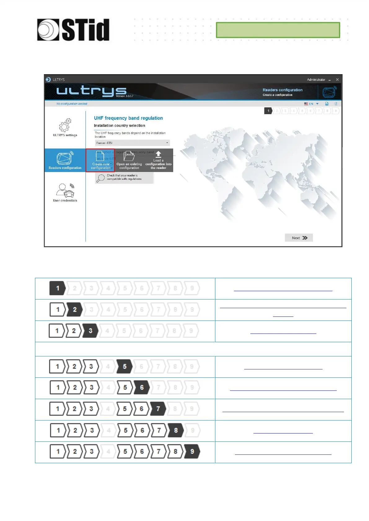 The reader configuration is done in 8 steps. To move from one stage to another, you must click