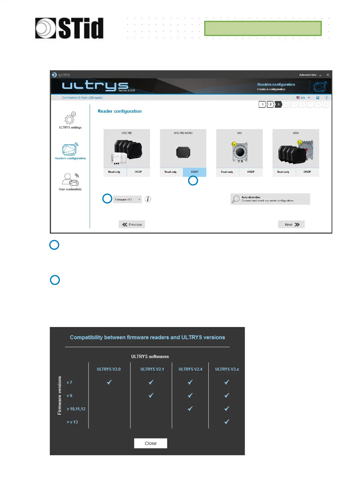SPECTRE NANO SNA-Wx3-A/U04-7OS can be configured in OSDP™ mode from firmware