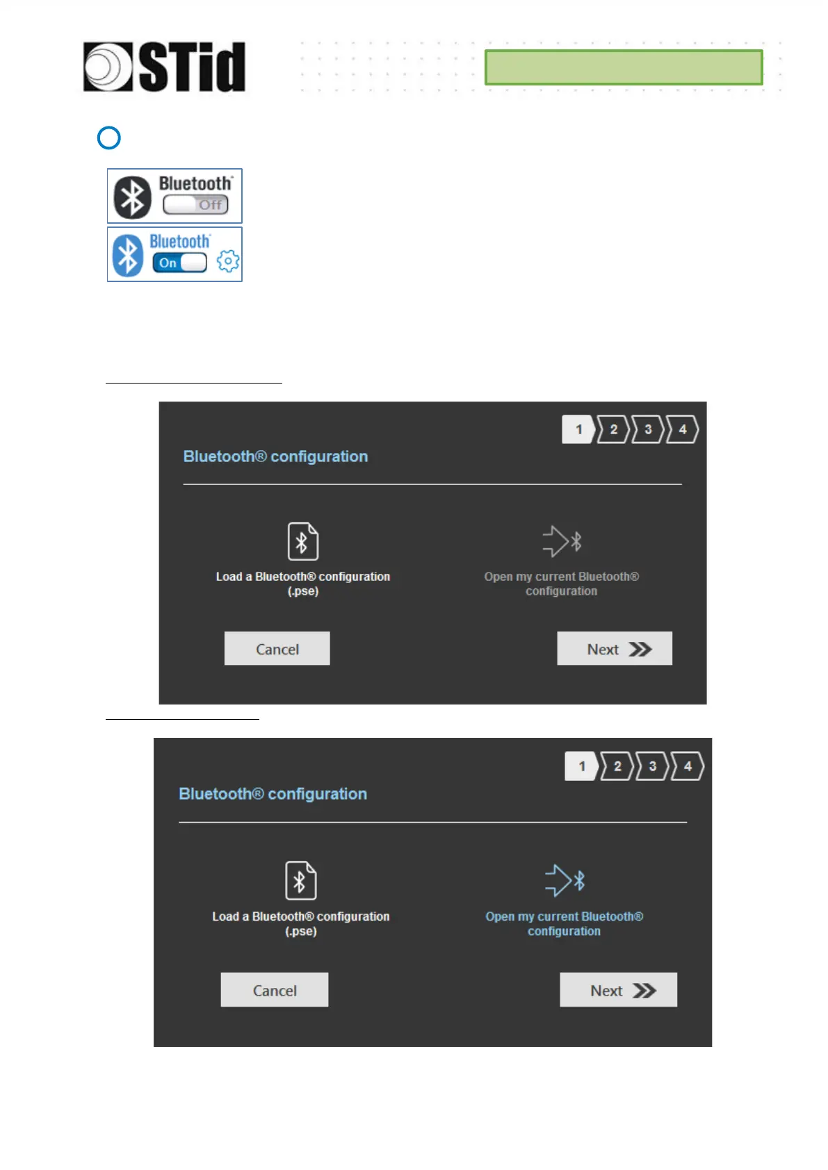 There are two possible displays of Step 1, depending on whether a Bluetooth® configuration