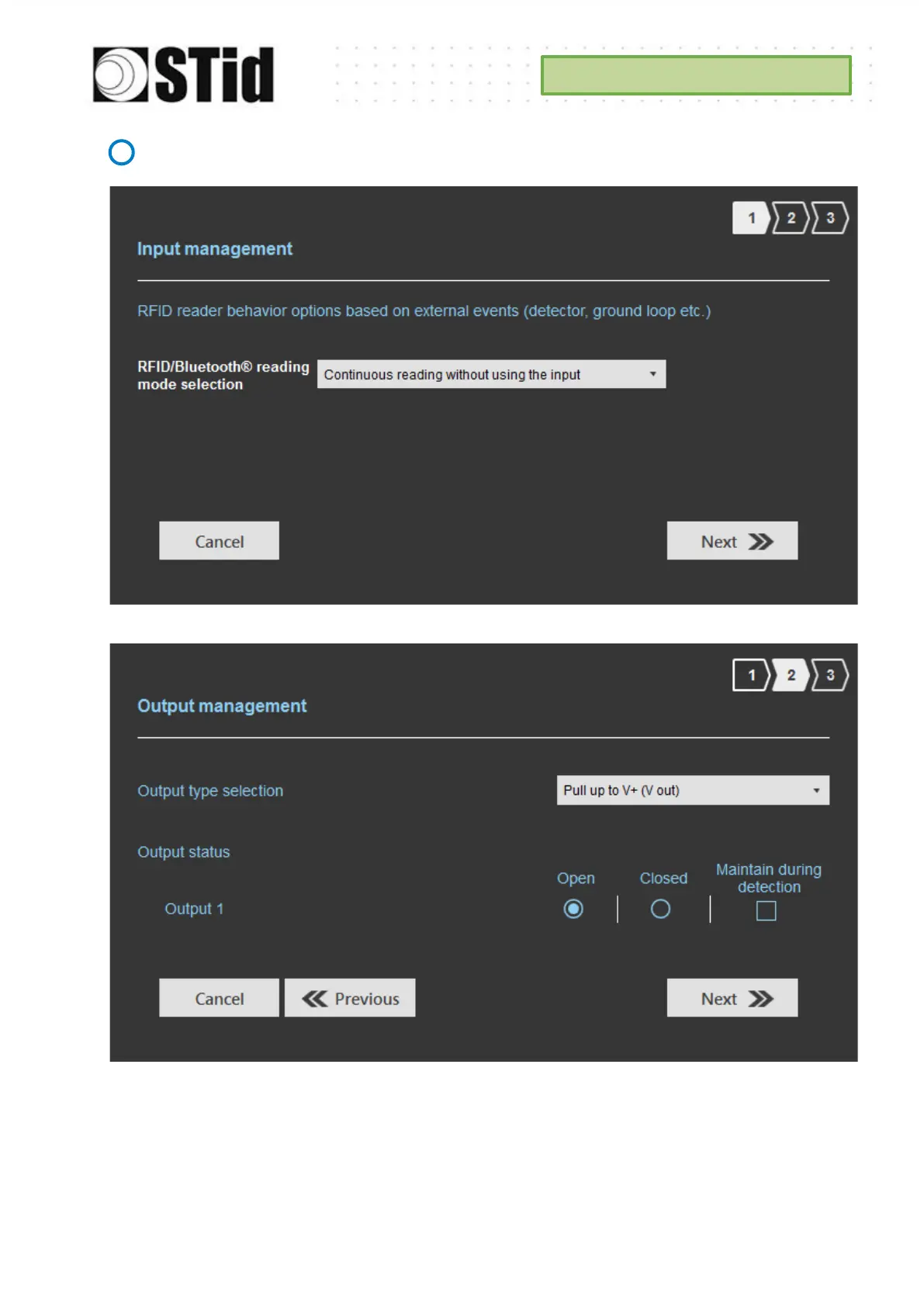 Status of outputs: select for each output the default state ‘Open’ or ‘Closed’ and if the state is