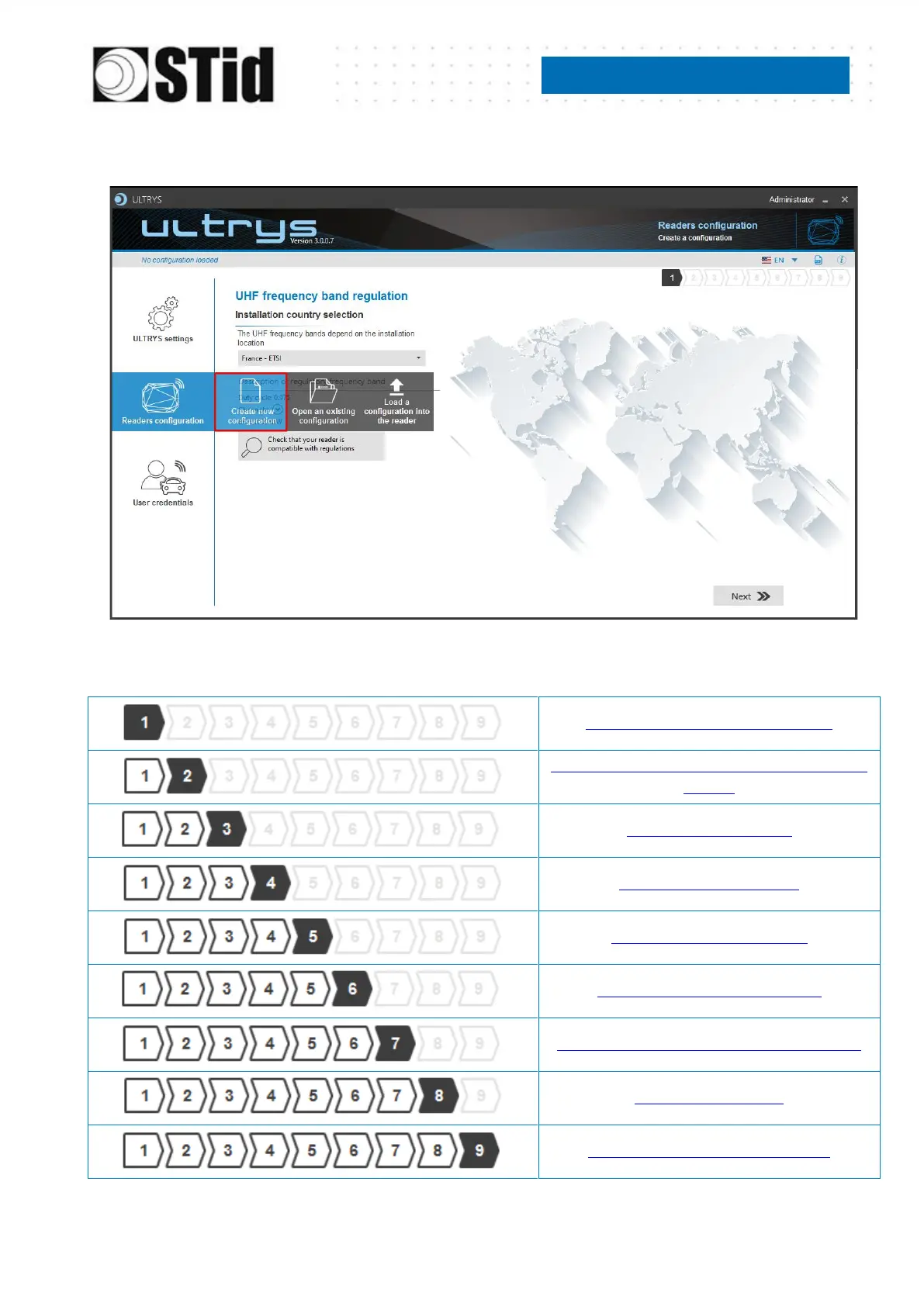 The reader configuration is done in 9 steps. To move from one stage to another, you must click