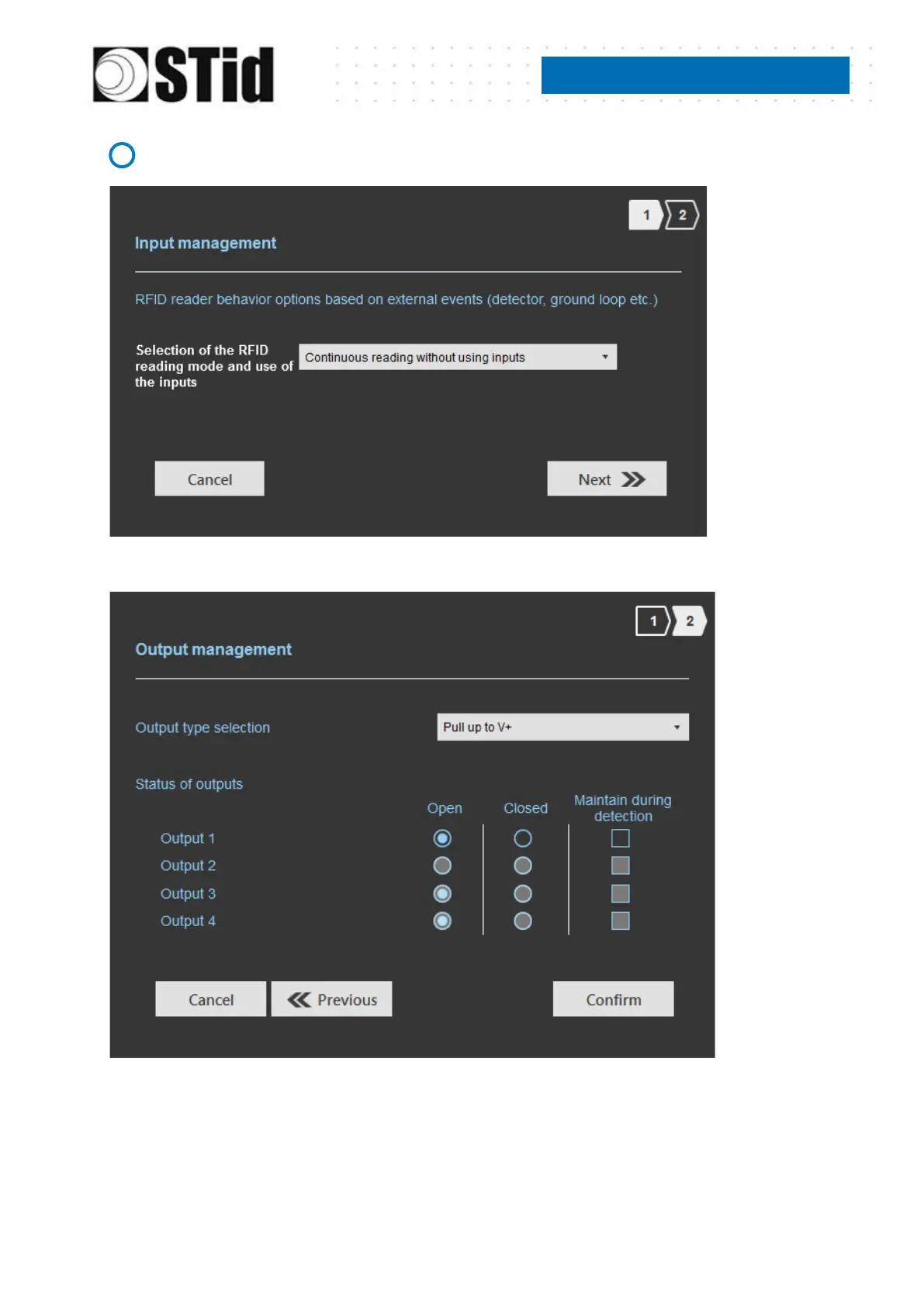 Status of outputs: select for each output the default state ‘Open’ or ‘Closed’ and if the state is