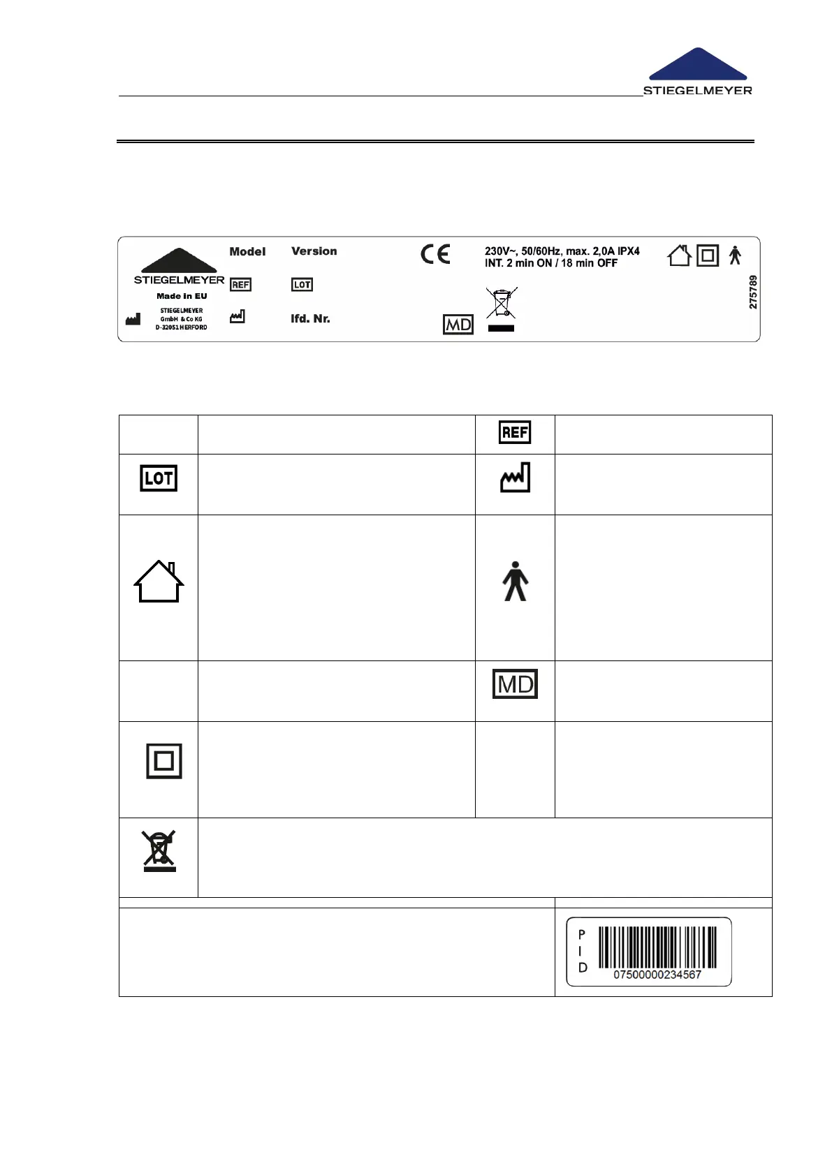 The following type plate with bed-specific electrical data and other symbols is