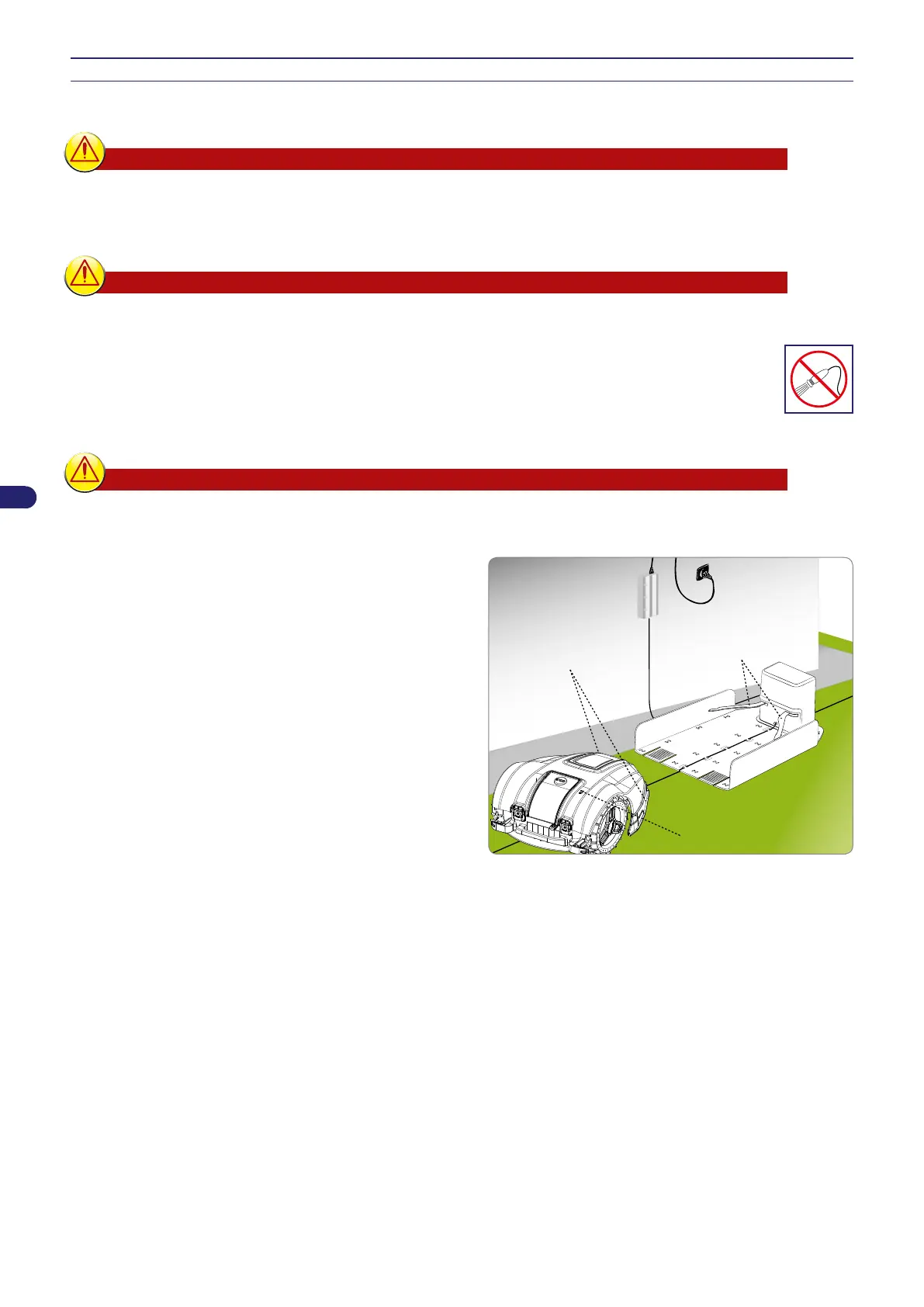 For at undgå uoprettelige skader på de elektriske og elektroniske komponenter må robotten ikke nedsænkes