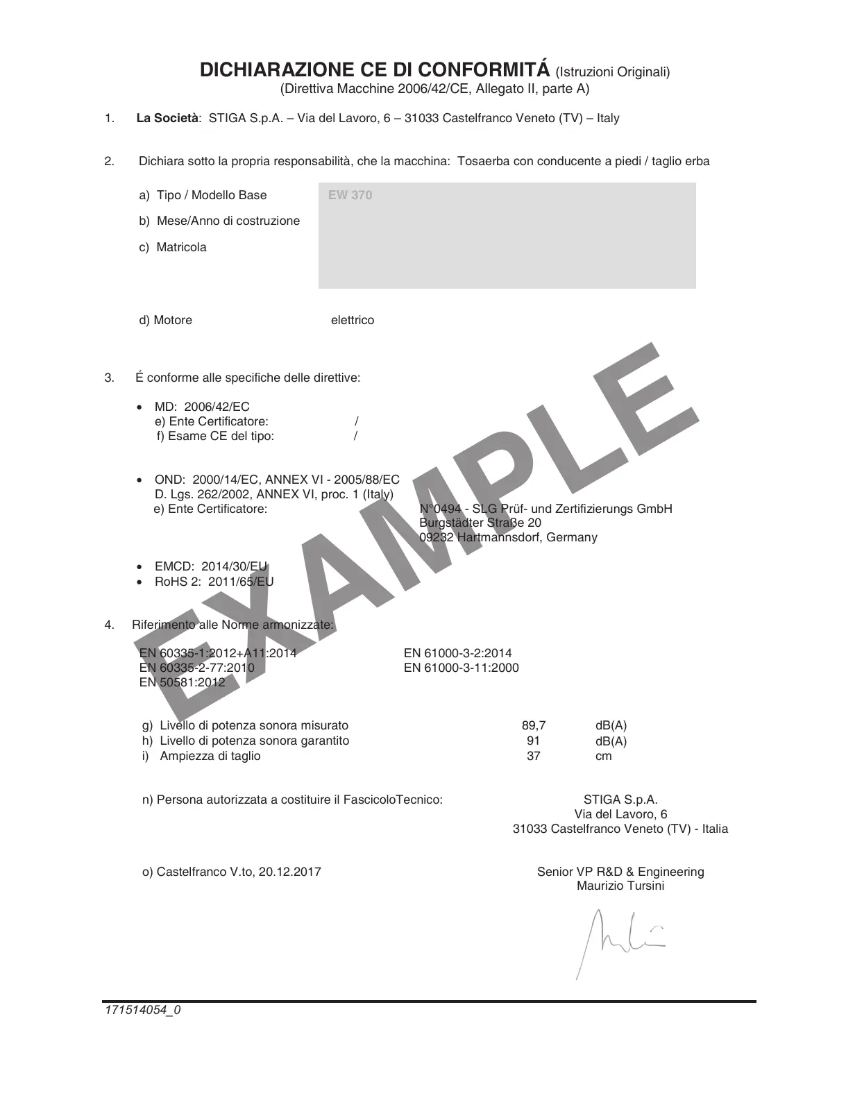 n) Persona autorizzata a costituire il FascicoloTecnico: STIGA S.p.A.