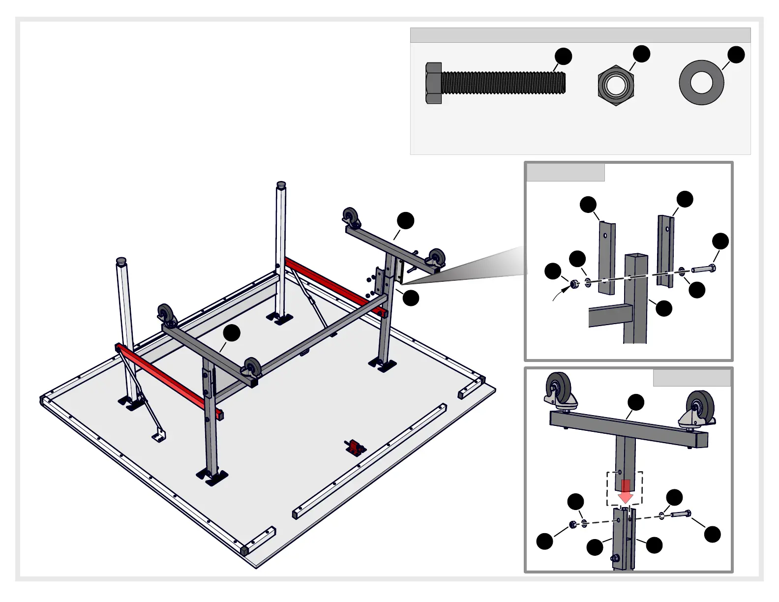 5. Inserte el Tubo de Soporte con llantas (n°2) entre los conectores