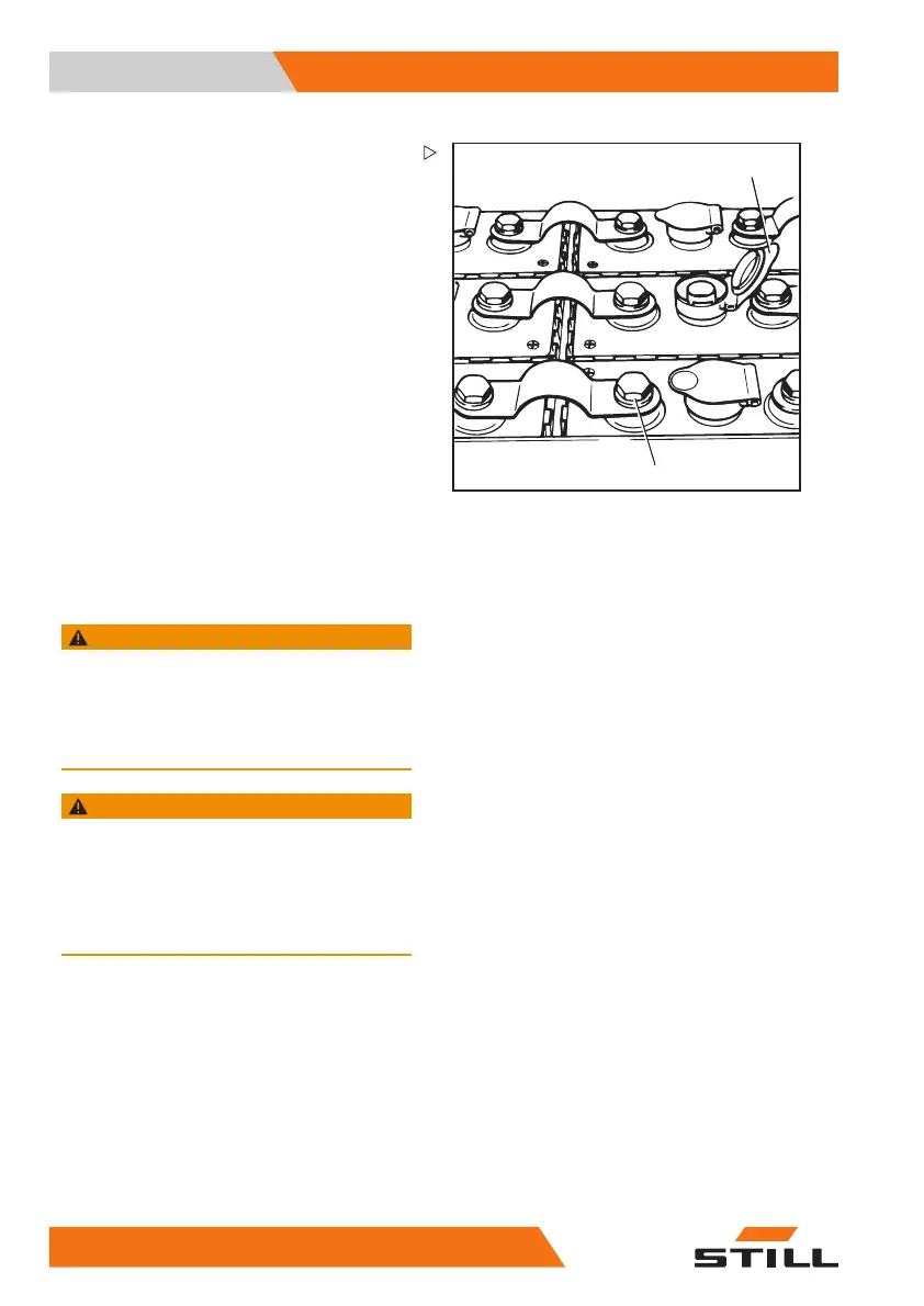 – Open filler cap (1) and check the acid level.