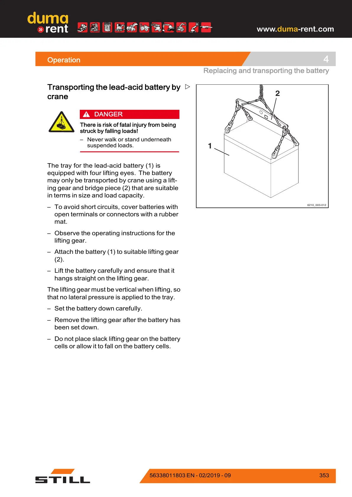 – Do not place slack lifting gear on the battery
