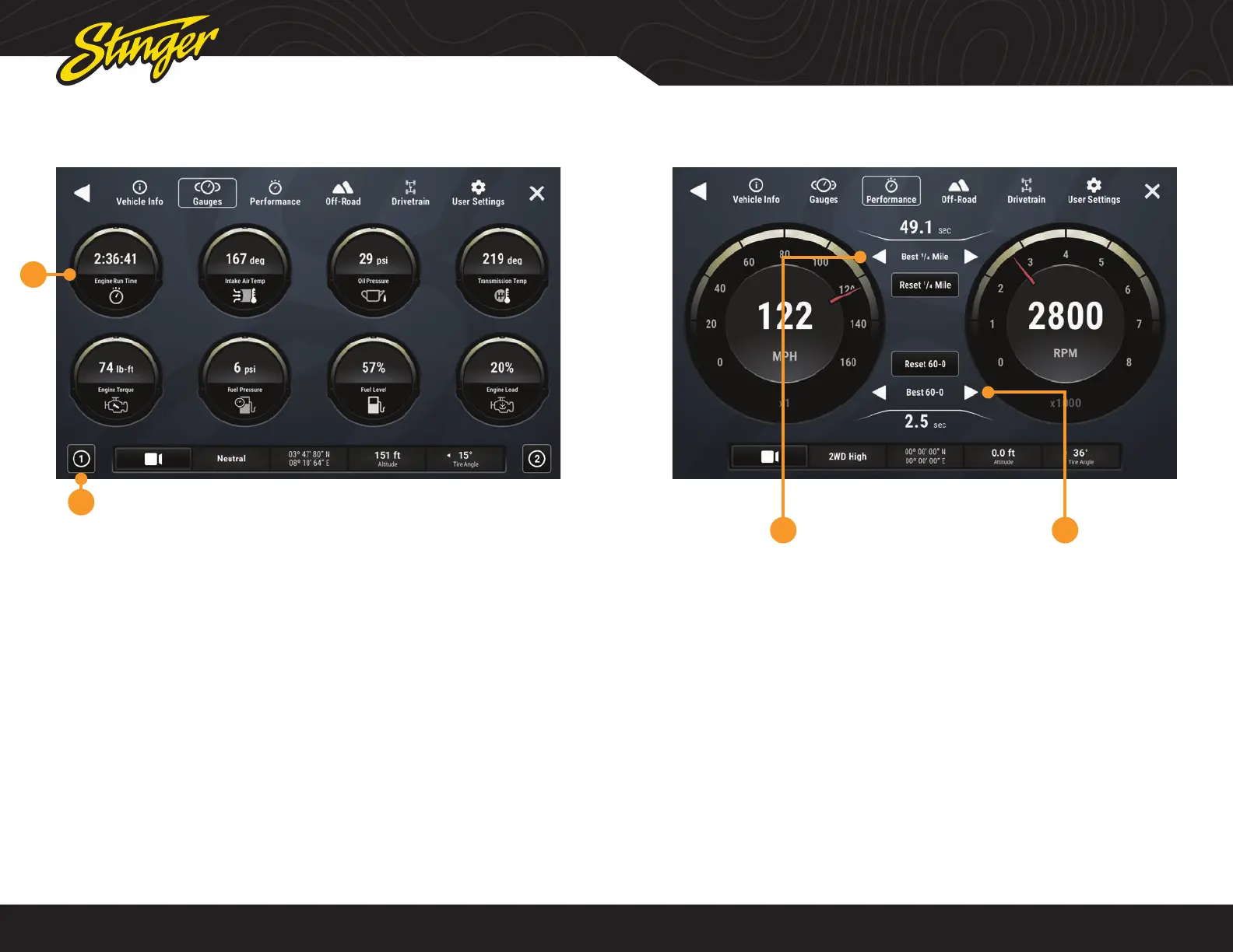 Press the HOME BUTTON > Vehicle Info > Performance to access Performance.