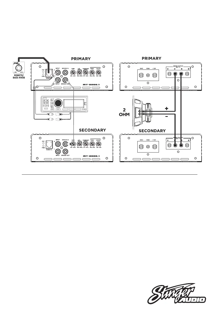 negative speaker terminal. 2 ohm minimum! All adjustments are made on the Primary amplifier.