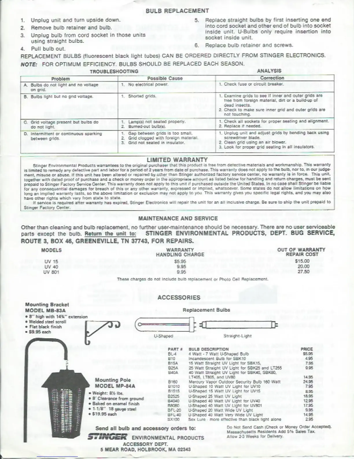 Stinger UV-15 - Bulb Replacement and Troubleshooting; Bulb Replacement Procedure; Troubleshooting Common Issues; Warranty and Service Information