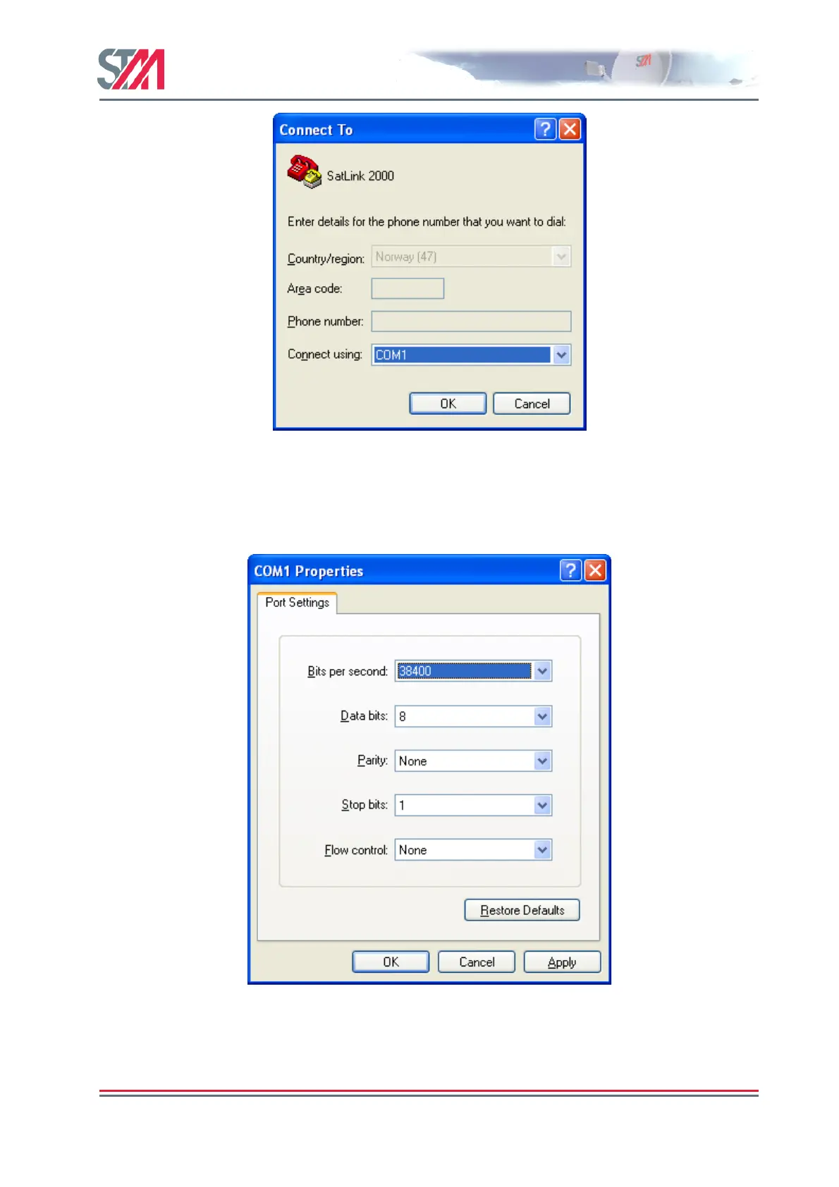 Select the COM port where the serial cable attached to the STM SatLink VSAT is connected, and click