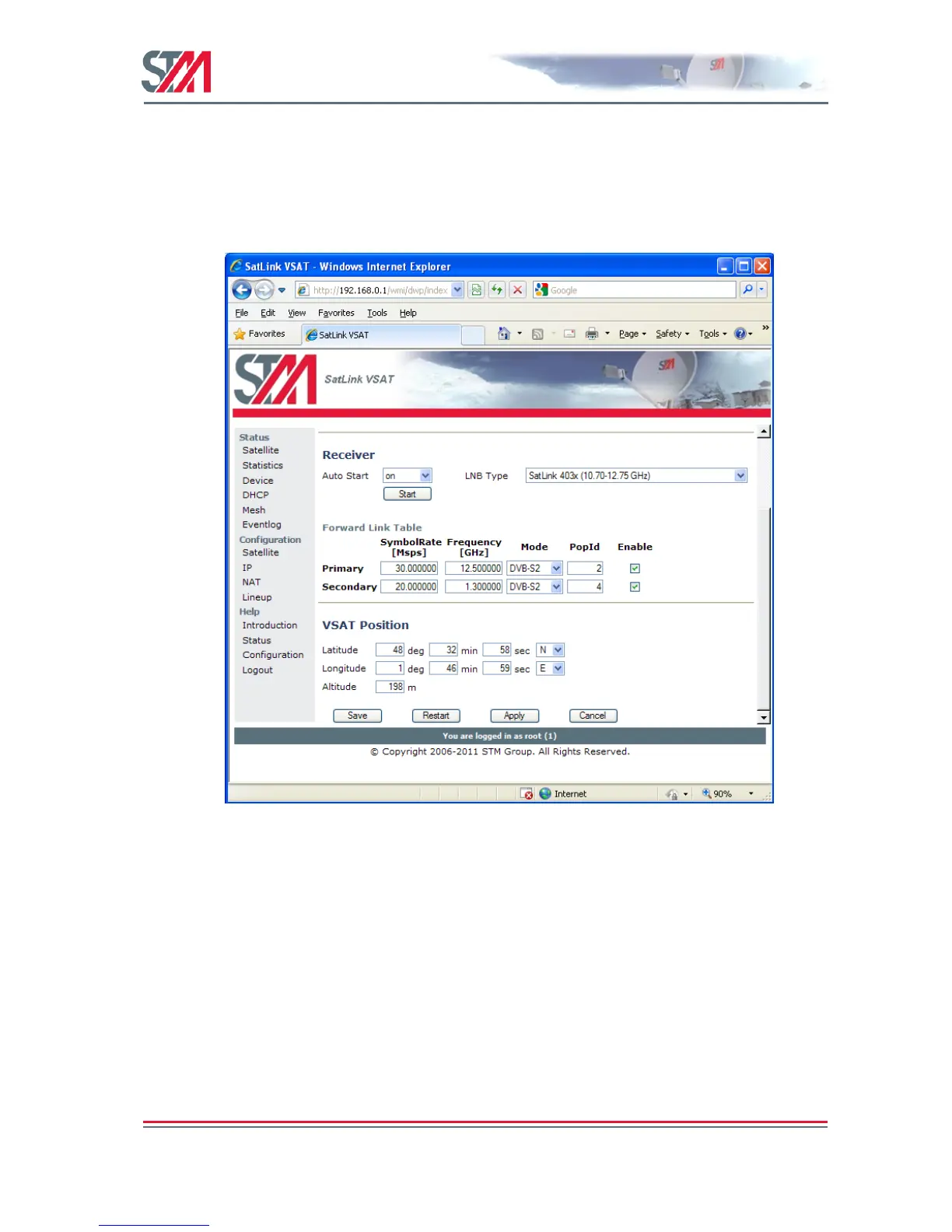 The VSAT is normally pre-configured to be used together with the SatLink 403x transceiver. But it is
