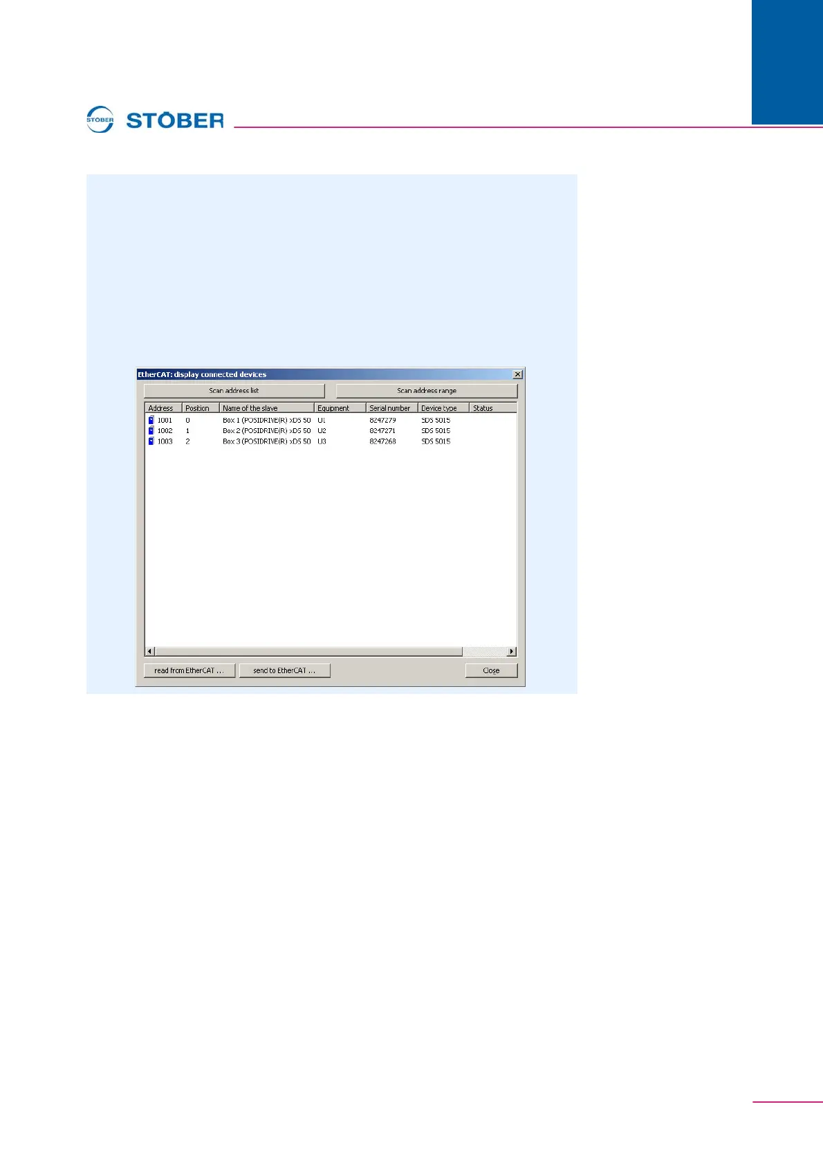 The list displays the inverters with their EtherCAT address, the name of