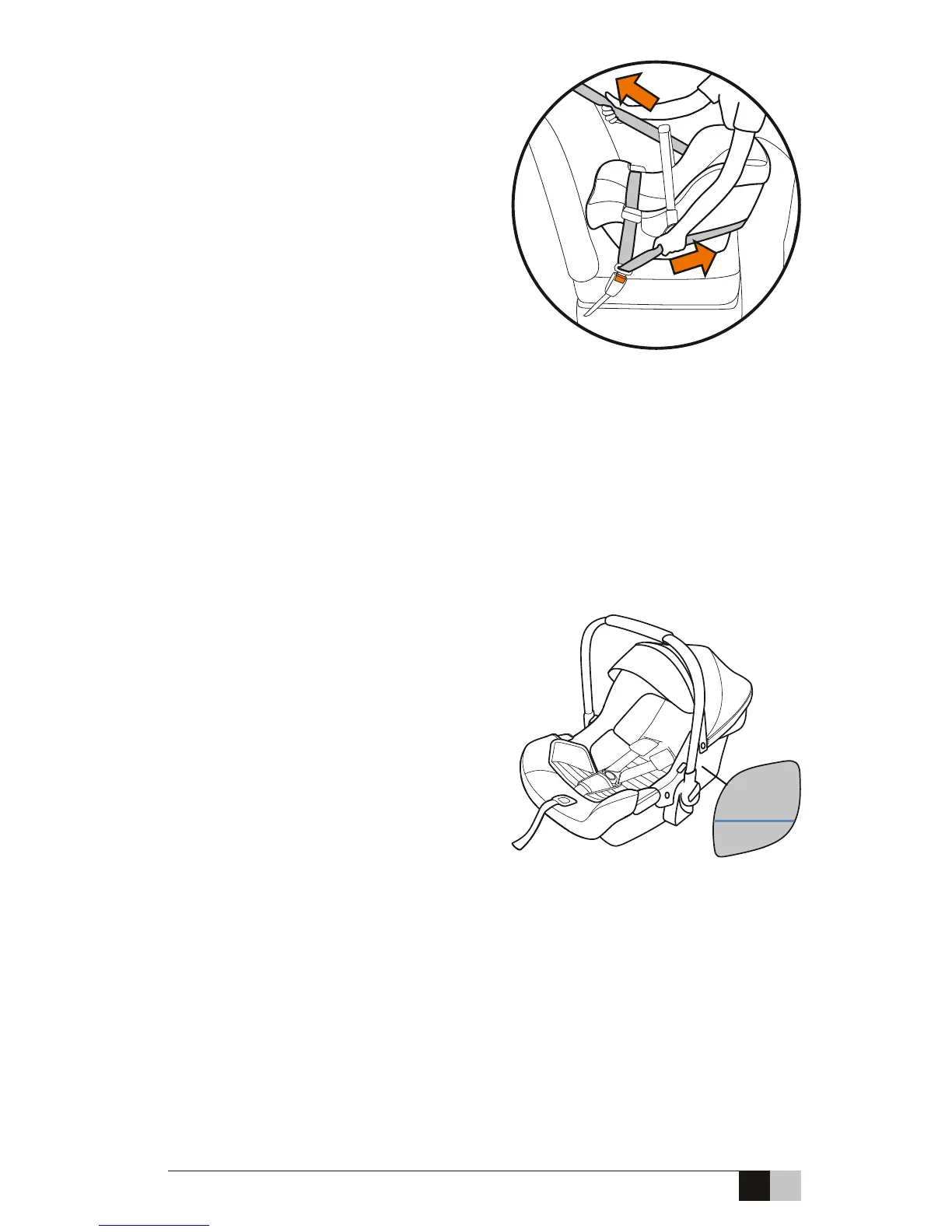 • Tighten the buckled belt by pushing down hard on the infant restraint and pulling hard on