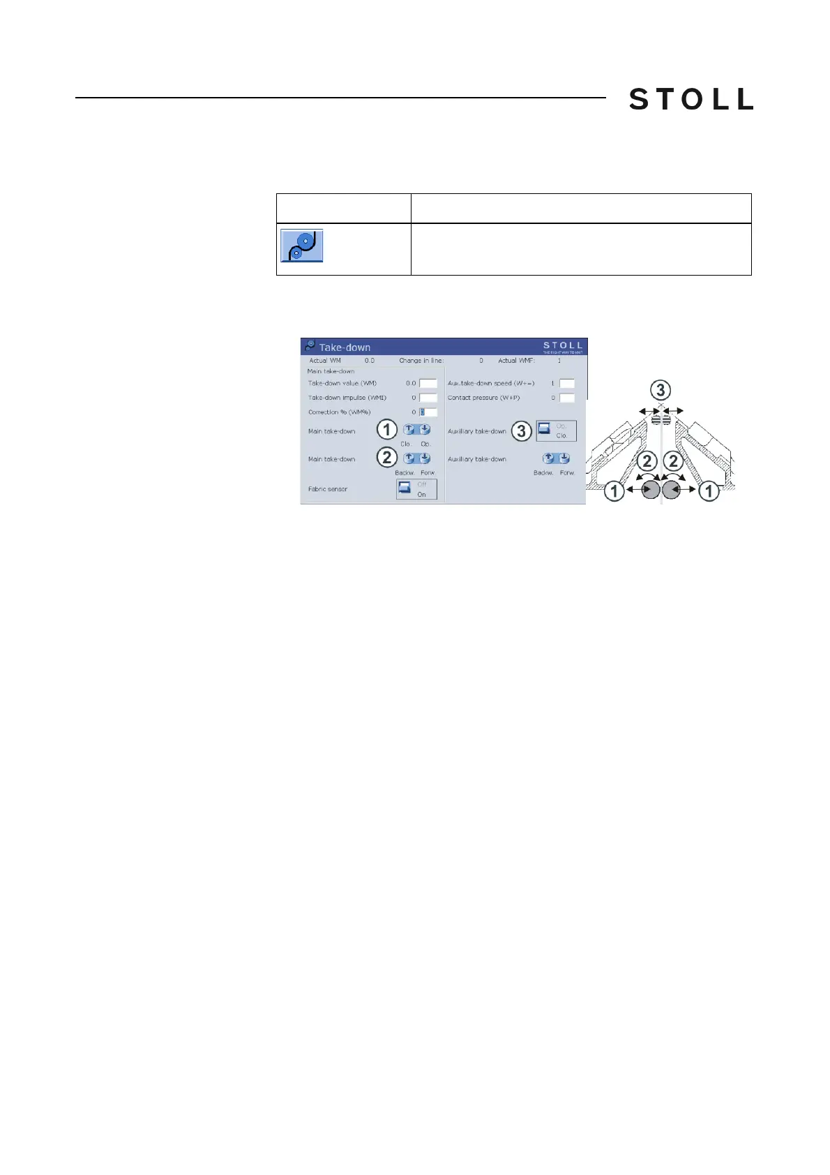 ➜ Press the "Main take-down Backw." (2) key until the fabric winding can