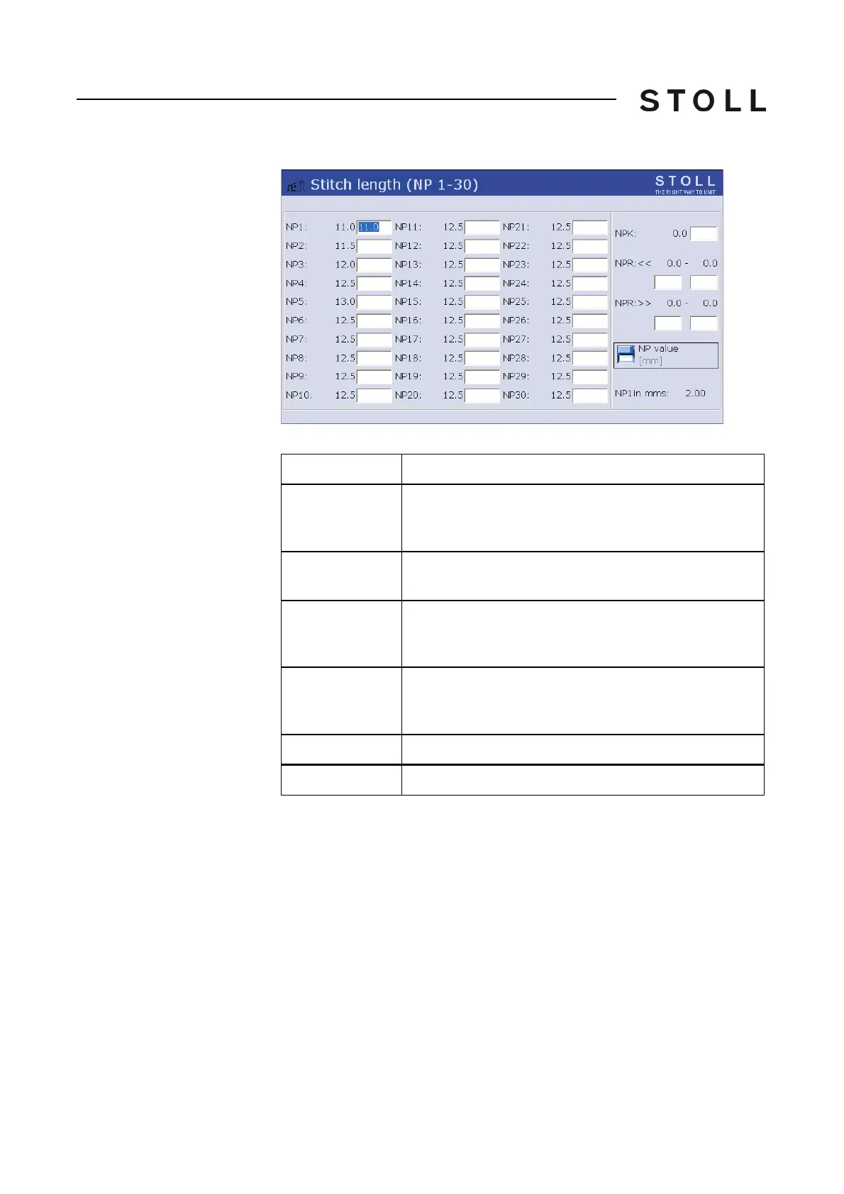 Stitch cam value (NP1-NP 100). Step width: 0.05.