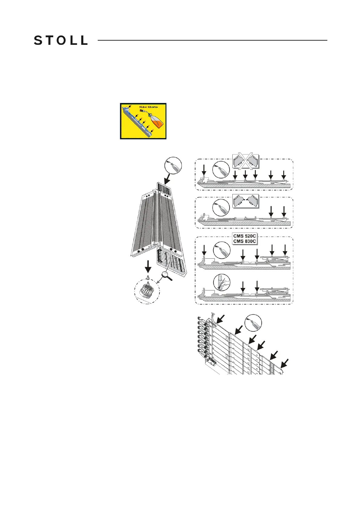 Start oiling the needle bed elements and then grease the butts of