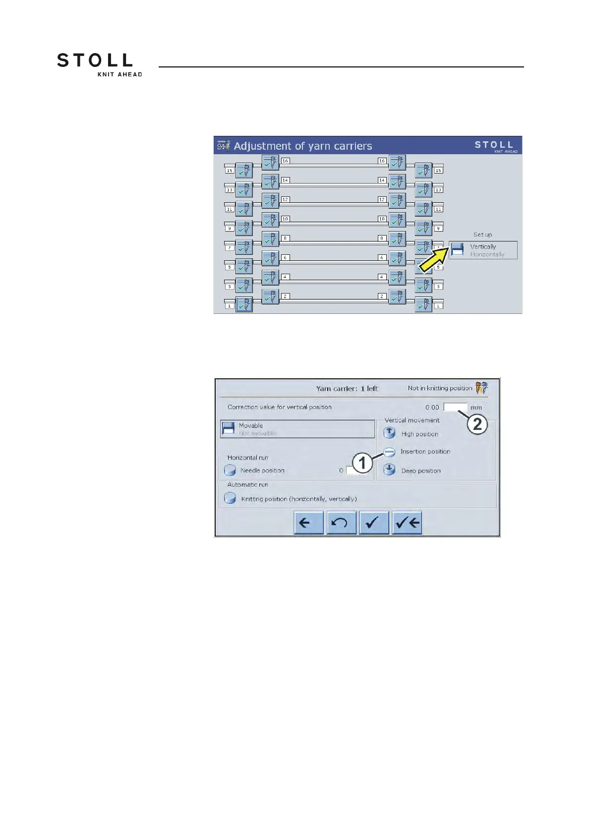 The "Adjustment of yarn carriers" window appears.