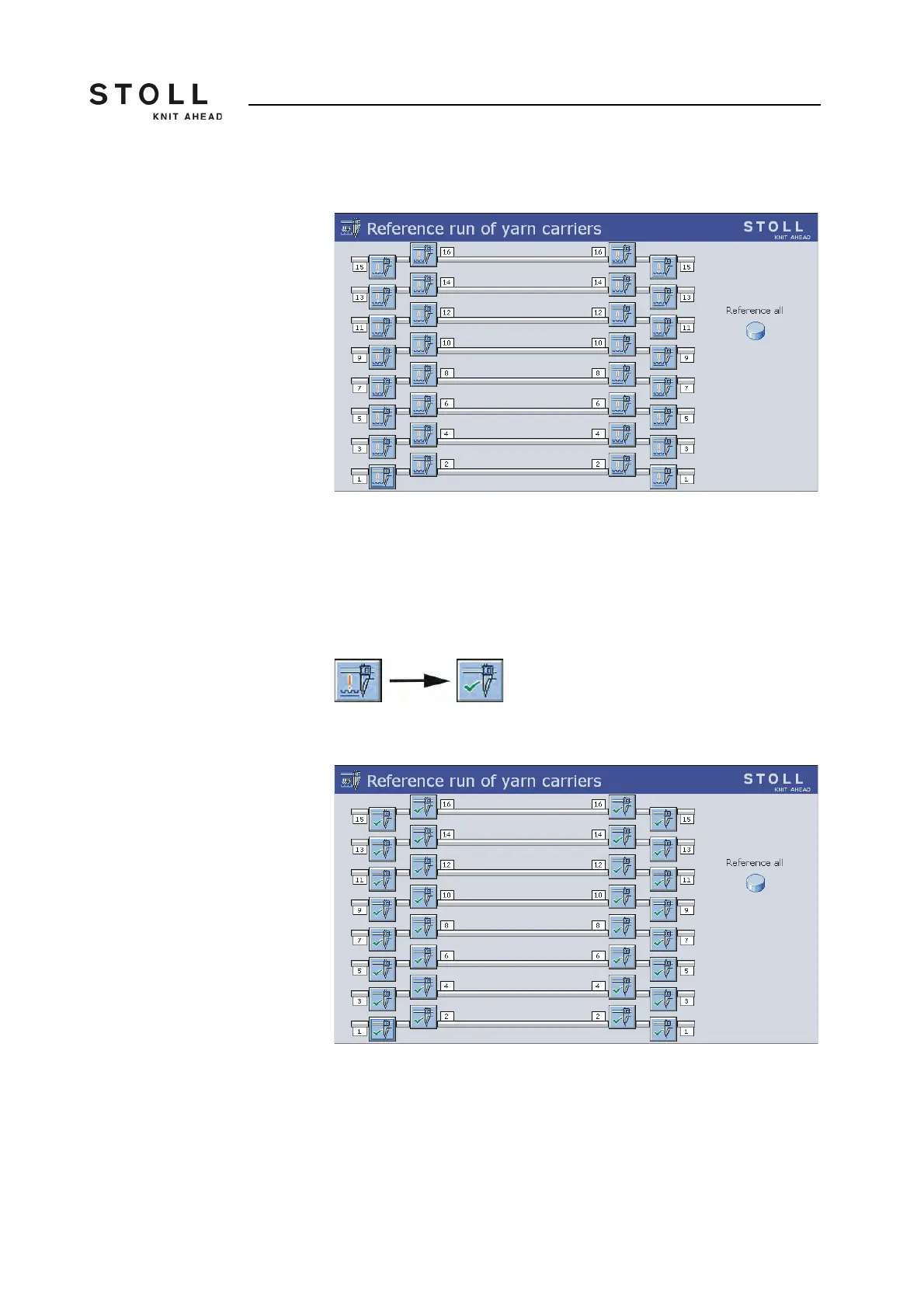 5. The yarn carriers are automatically referenced consecutively rail by rail.