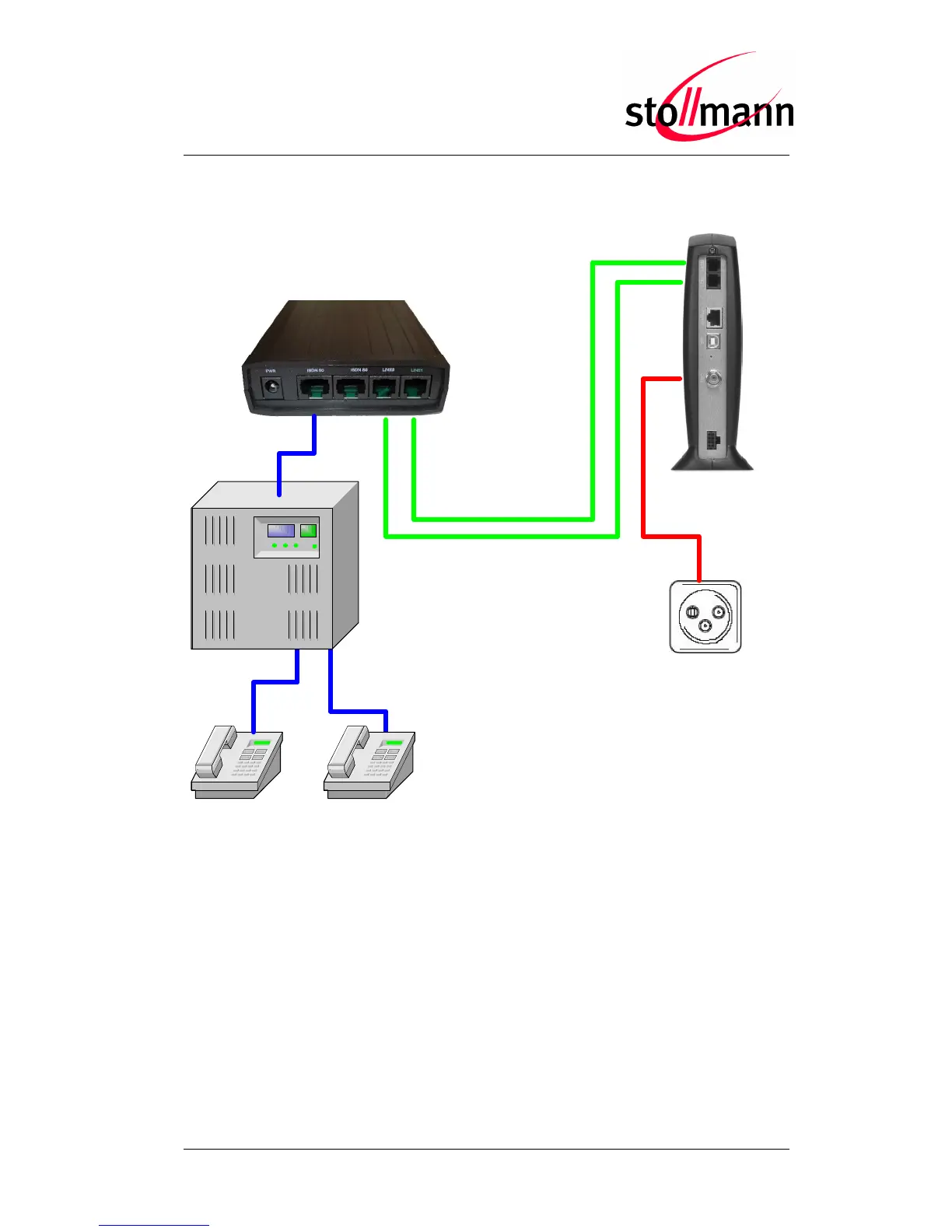 • Connect “LINE 1“ with the first analogue line, “LINE 2” with the second one. The