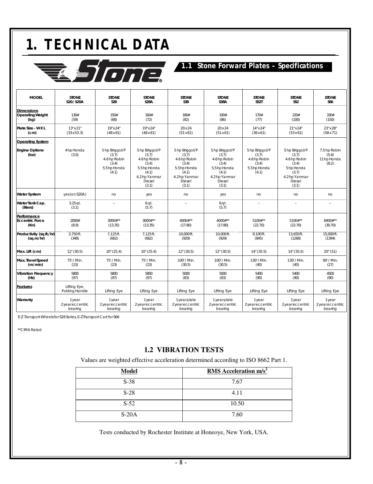 Stone S38 - Stone Forward Plates Specifications; Vibration Tests