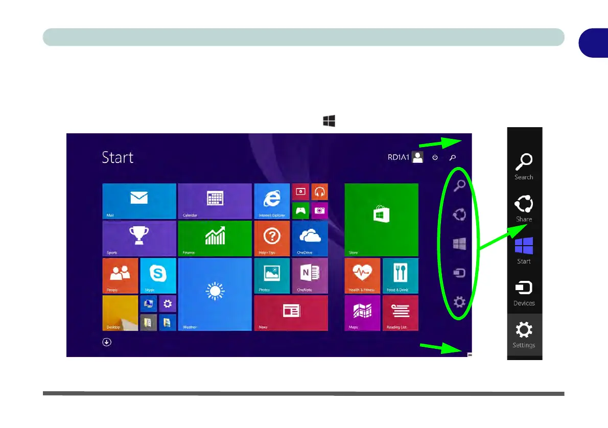 Share, Start, Devices and Settings menus. To access up the Charms Bar move the cursor to the upper or lower