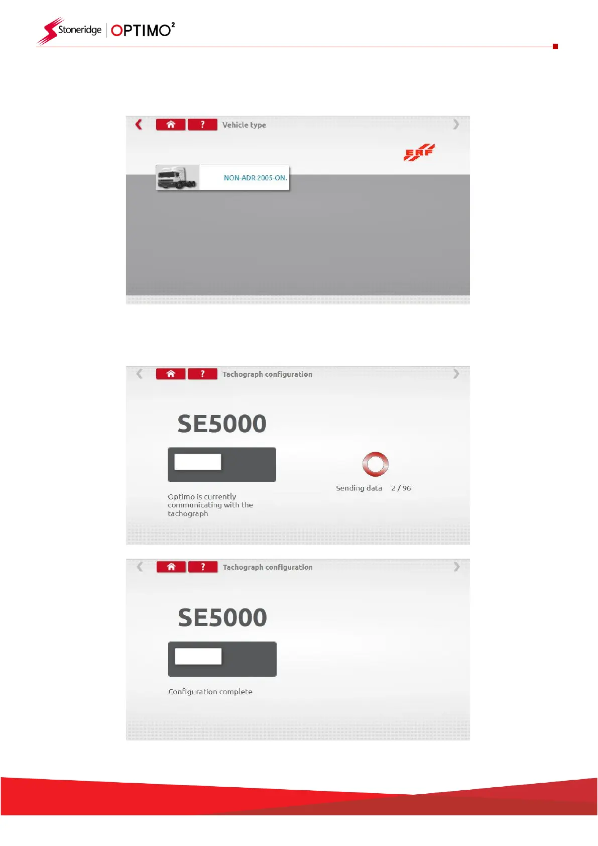 Tap icon for correct vehicle type, and a screen shows Optimo² communicating with the tachograph.