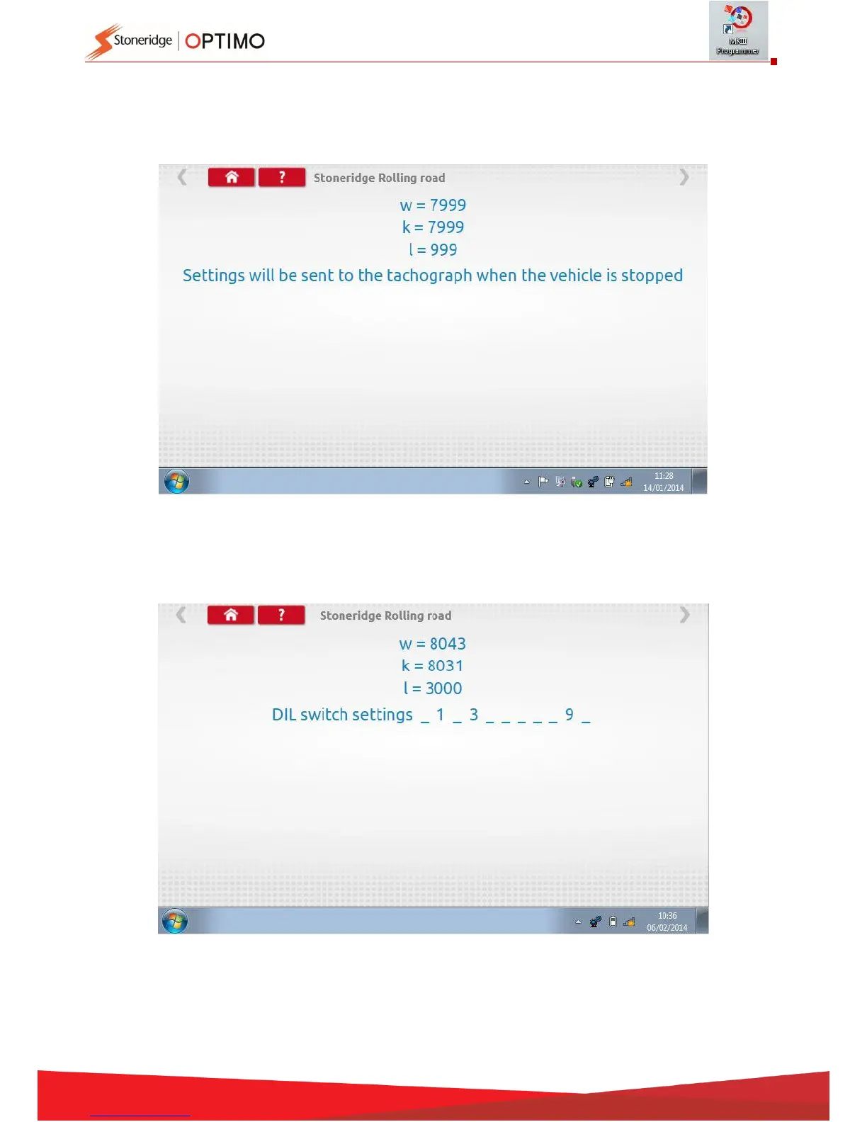 For round tachographs w, k and l factors are displayed, plus the DIL switch settings which must