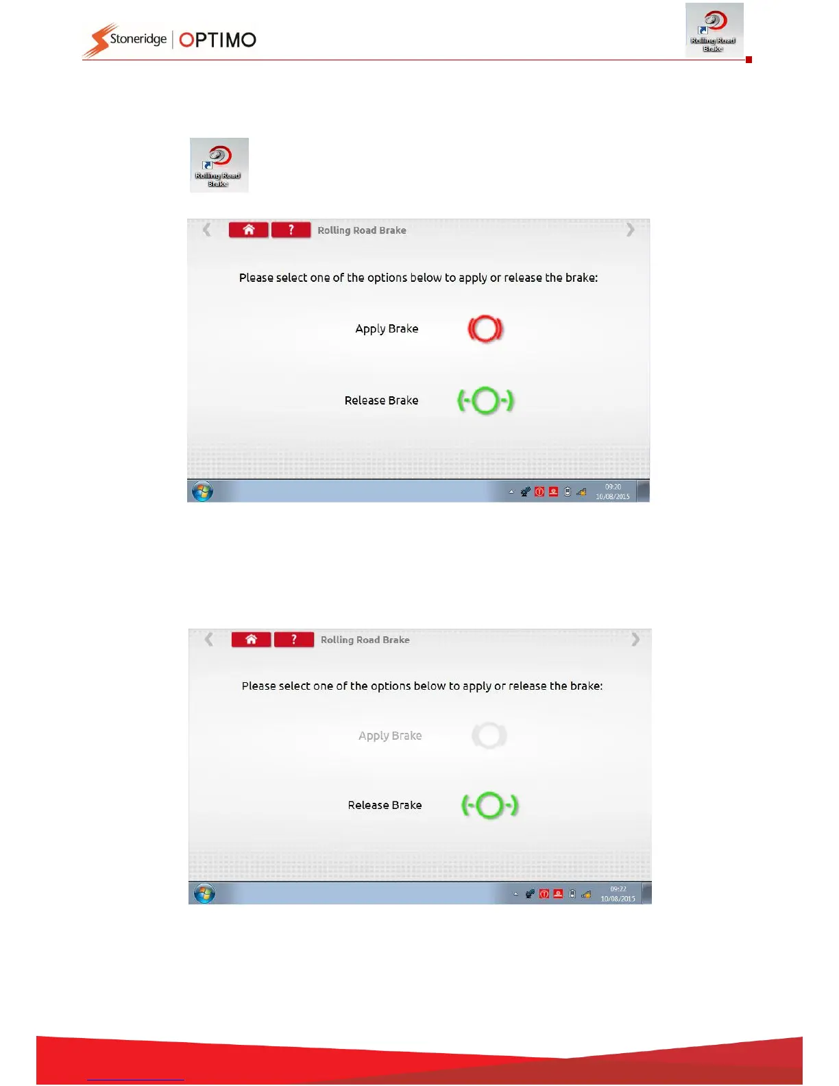 Tapping enables a user to Apply or Release the Rolling Road brake via Optimo.