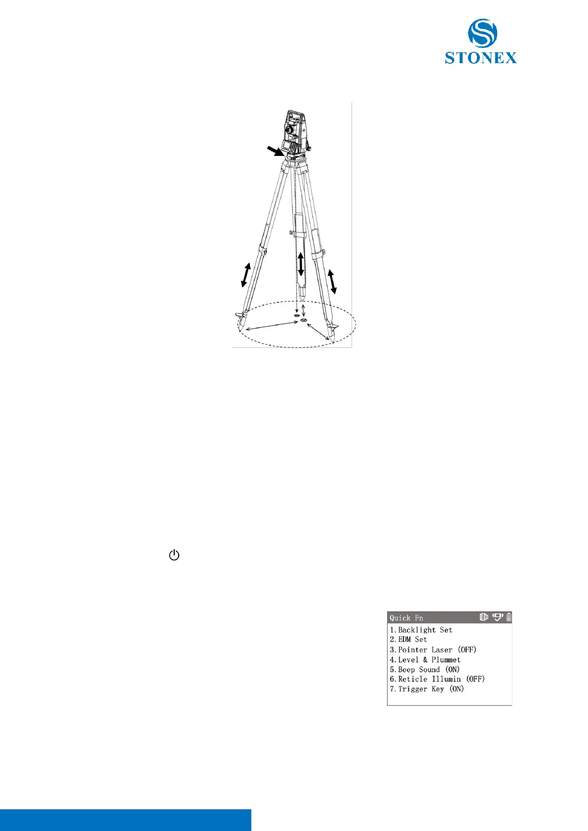 1. Press and hold [ ] to power on the instrument. If tilt compensator is on, the laser plummet will
