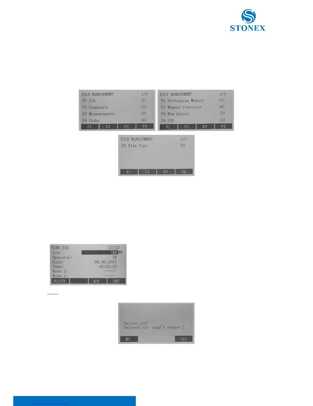 Press the {MENU} key and F4[JOB] to enter the File Management menu, which contains all functions for entering,