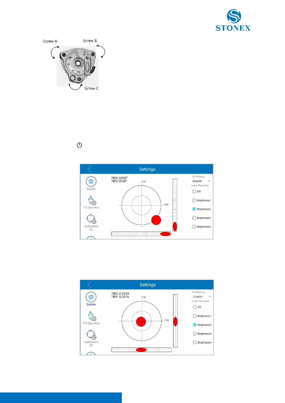 as reference. Adjust the screws to make the bubble, visible on the screen, in the center of the
