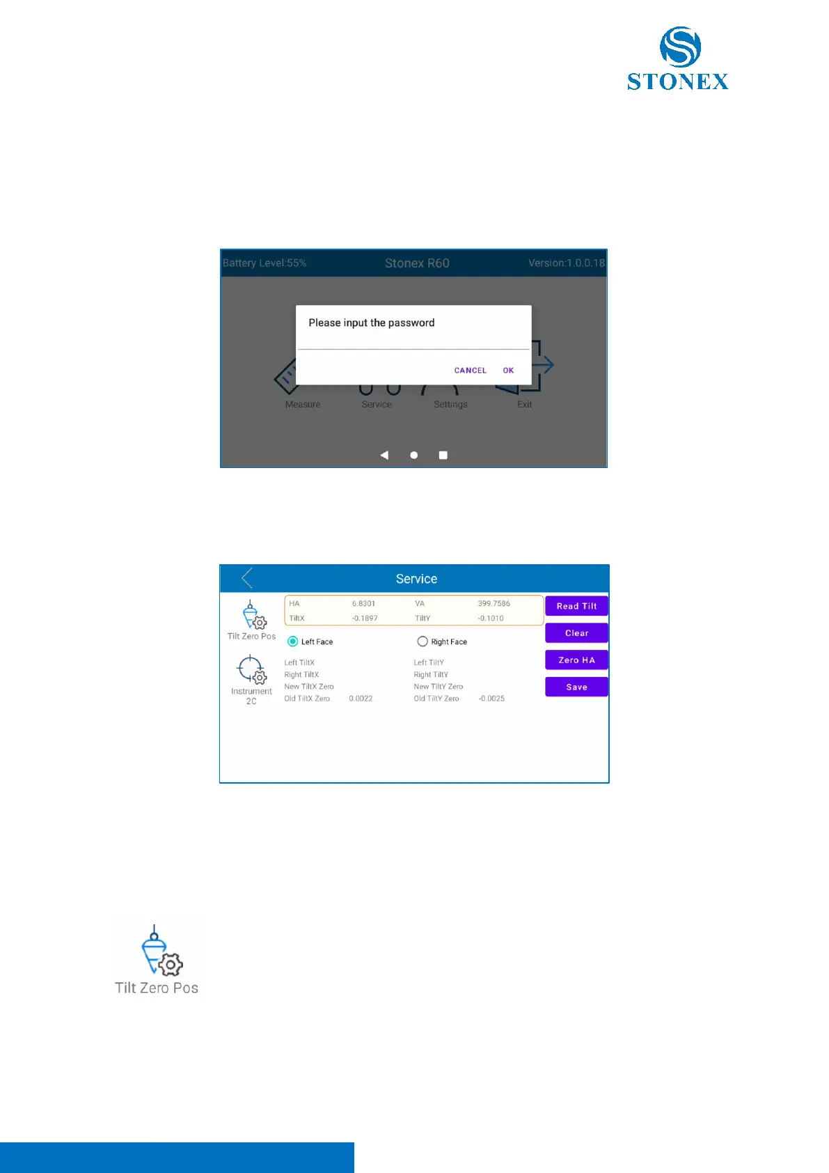 Choose “Tilt Zero Pos” to enter in tilt offset (zero position) page correction. In this