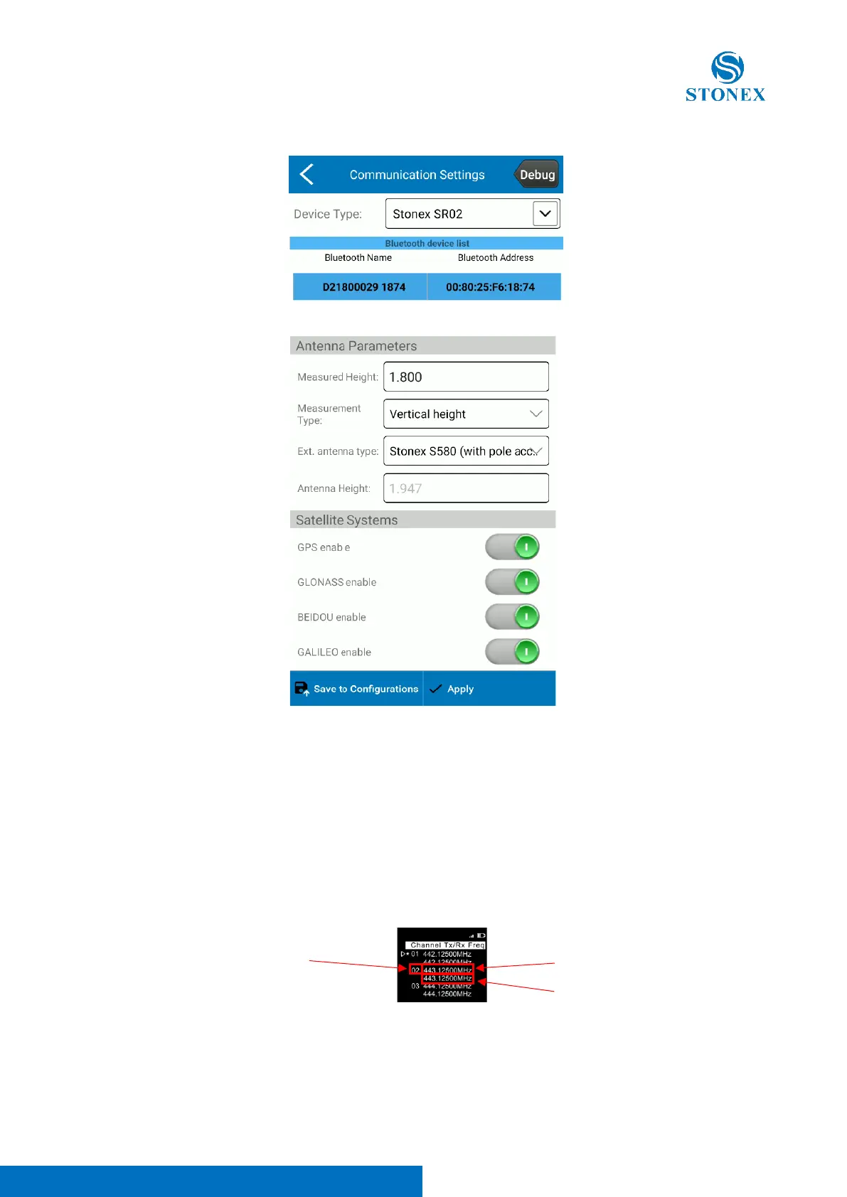 a. Select the frequency: Channel Tx/Rx Freq page, the usual frequencies utilized by Stonex devices are on
